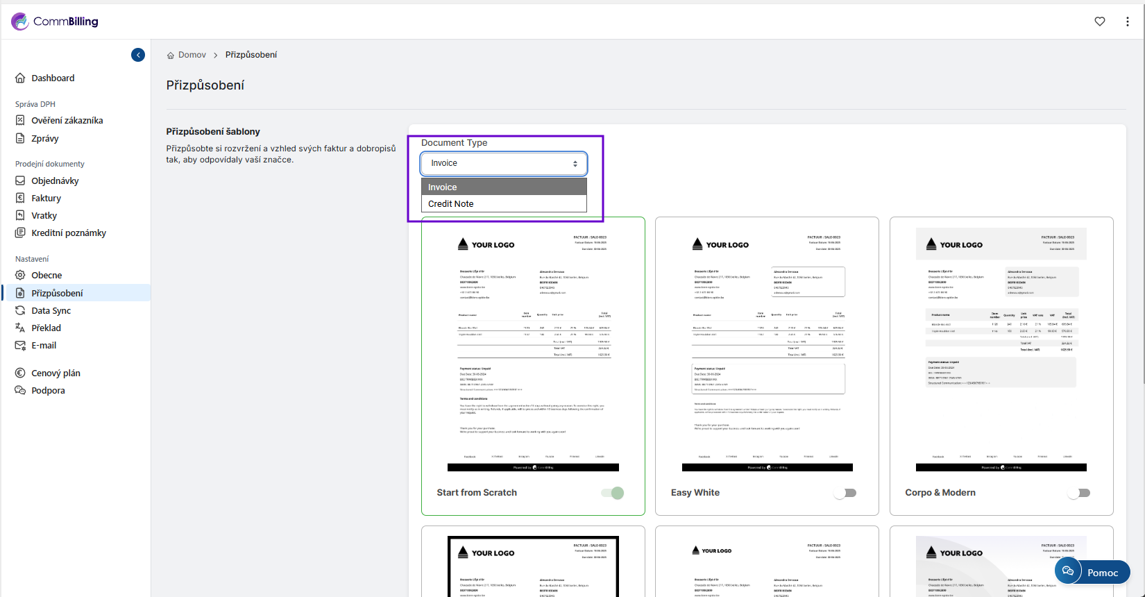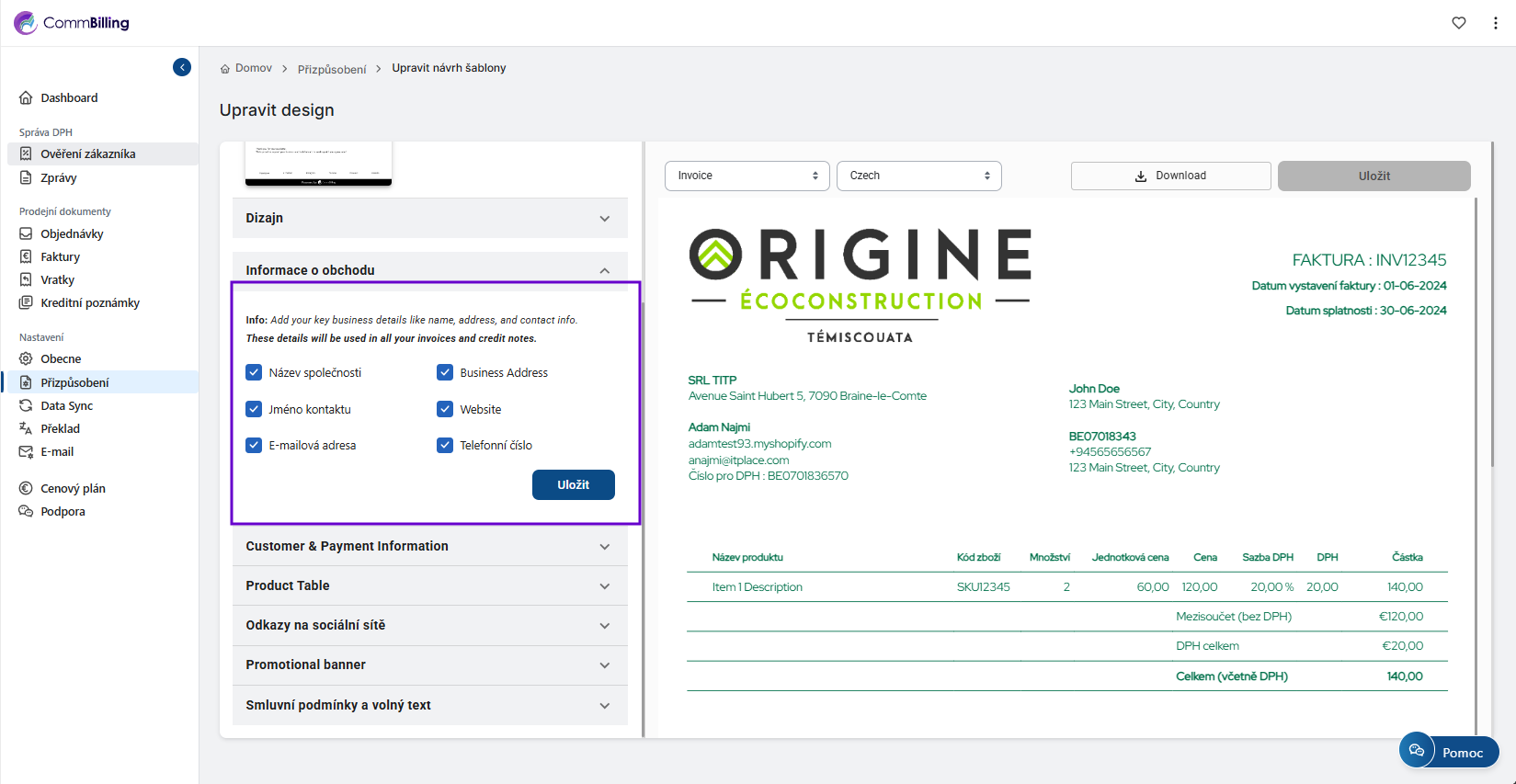 Správou toho, která pole se zobrazí na vašich fakturách, zajistíte, že vaše dokumenty budou přehledné, profesionální a obsahově relevantní. CommBilling vám poskytuje flexibilitu přizpůsobit každou fakturu potřebám vašeho podnikání a zároveň zachovat konzistentní image značky ve veškeré komunikaci se zákazníky.