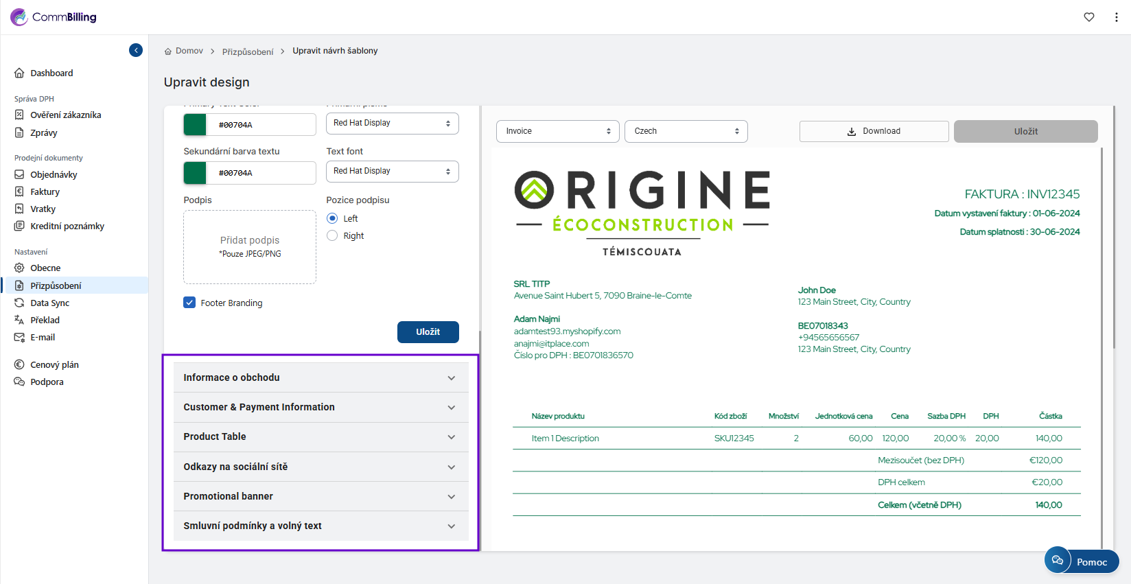 Viditelnost polí na faktuře můžete upravit přímo v nastavení přizpůsobení.