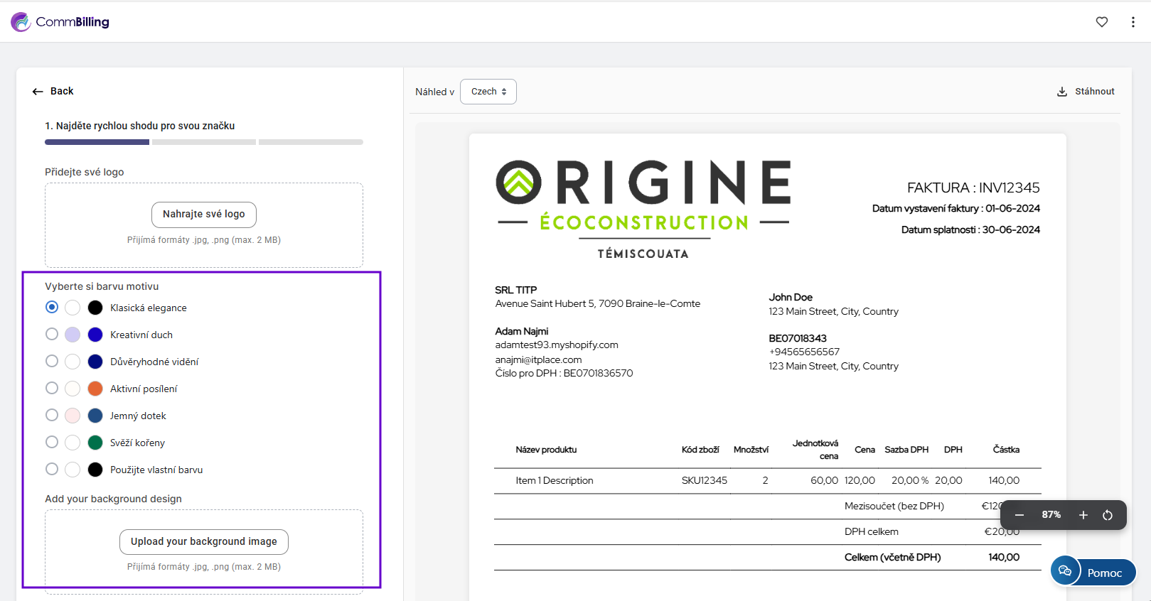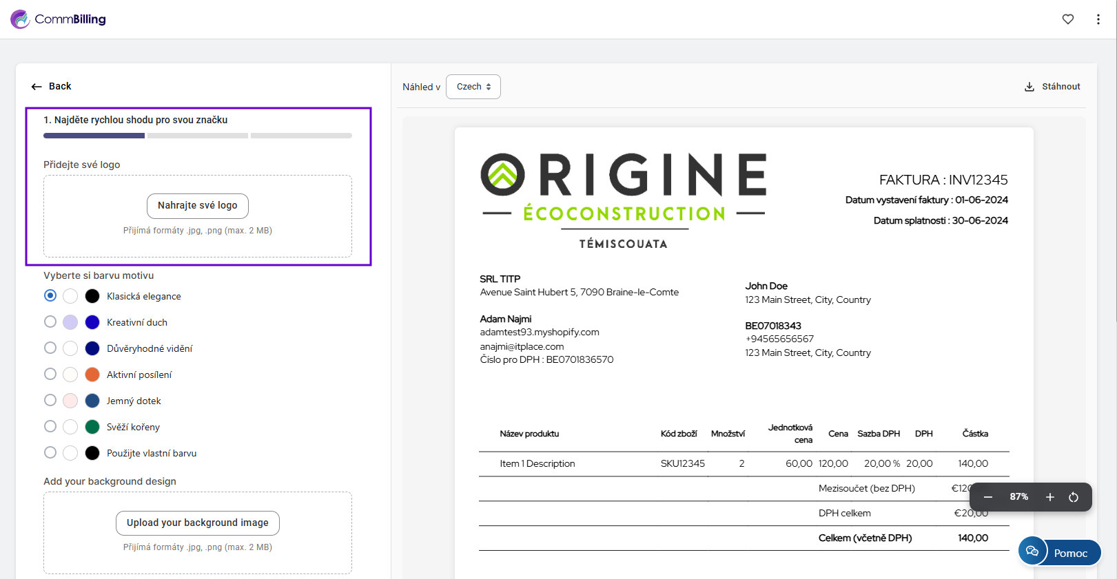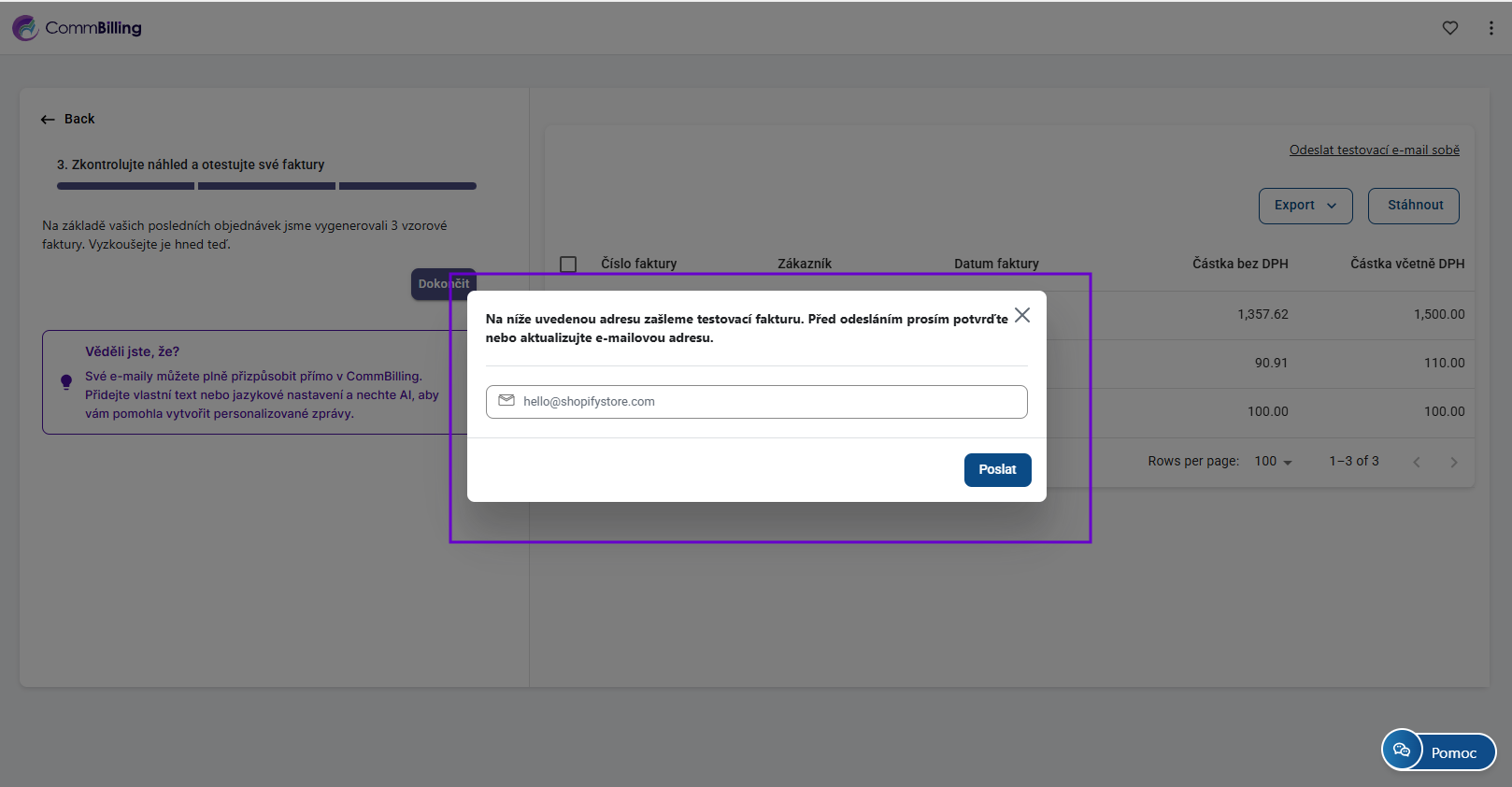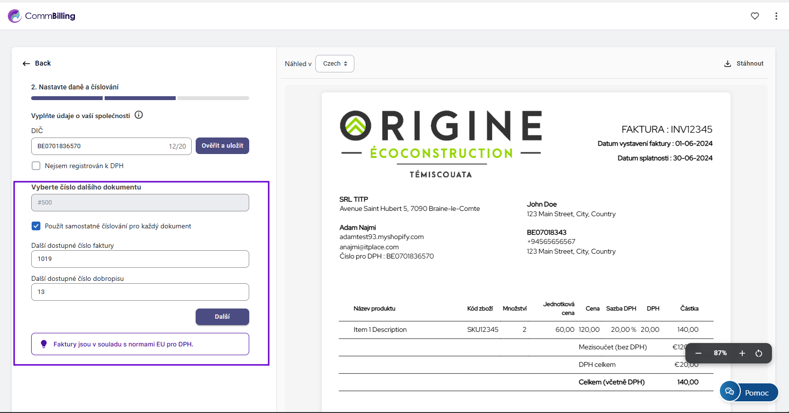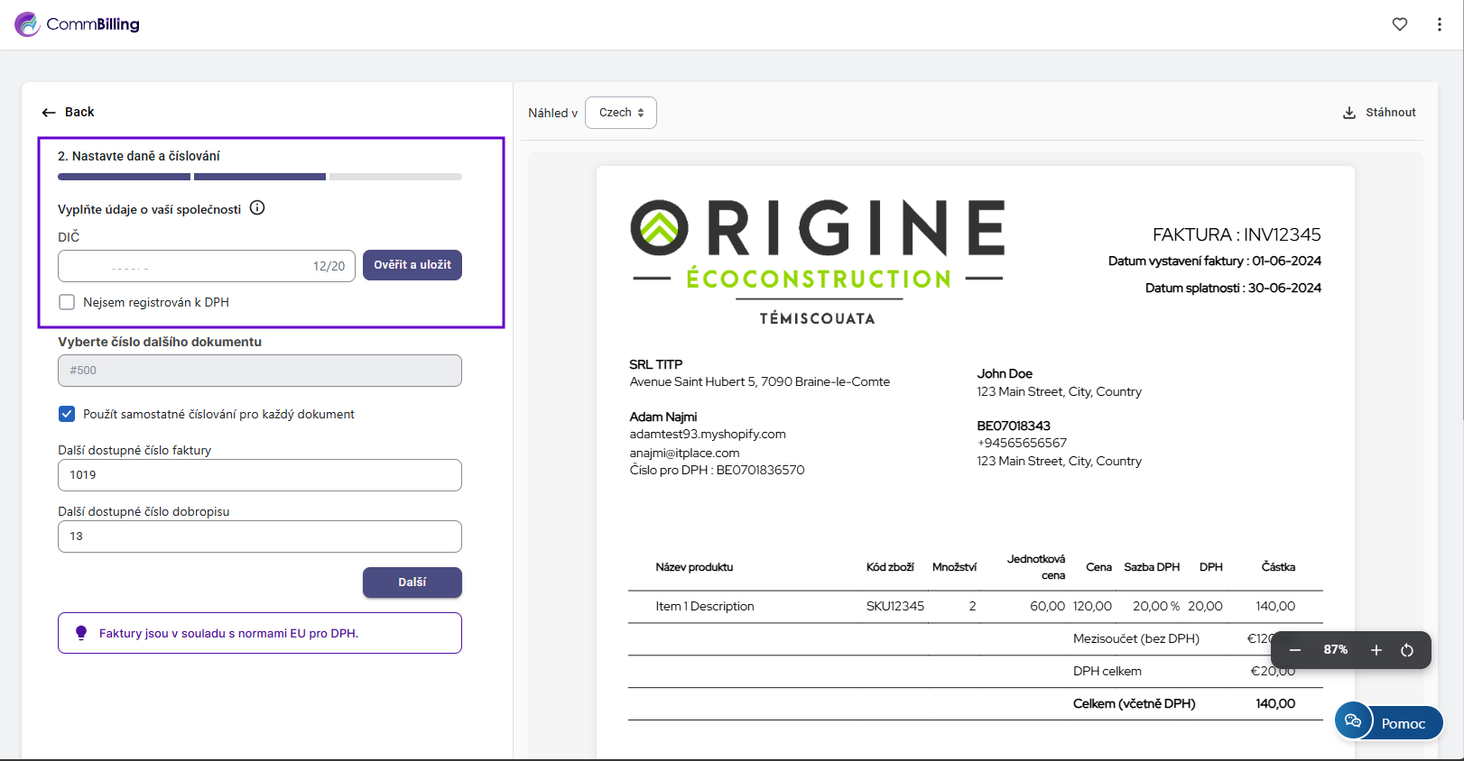 Nastavení CommBilling správným způsobem zajišťuje přesné zpracování DPH, plynulou synchronizaci objednávek, vystavování faktur v souladu s předpisy a plně automatizovaný fakturační proces. Tato počáteční konfigurace je zásadní pro to aby vaše prodejní dokumenty, automatizační pravidla a designové preference fungovaly bez problémů s vaším obchodem Shopify.