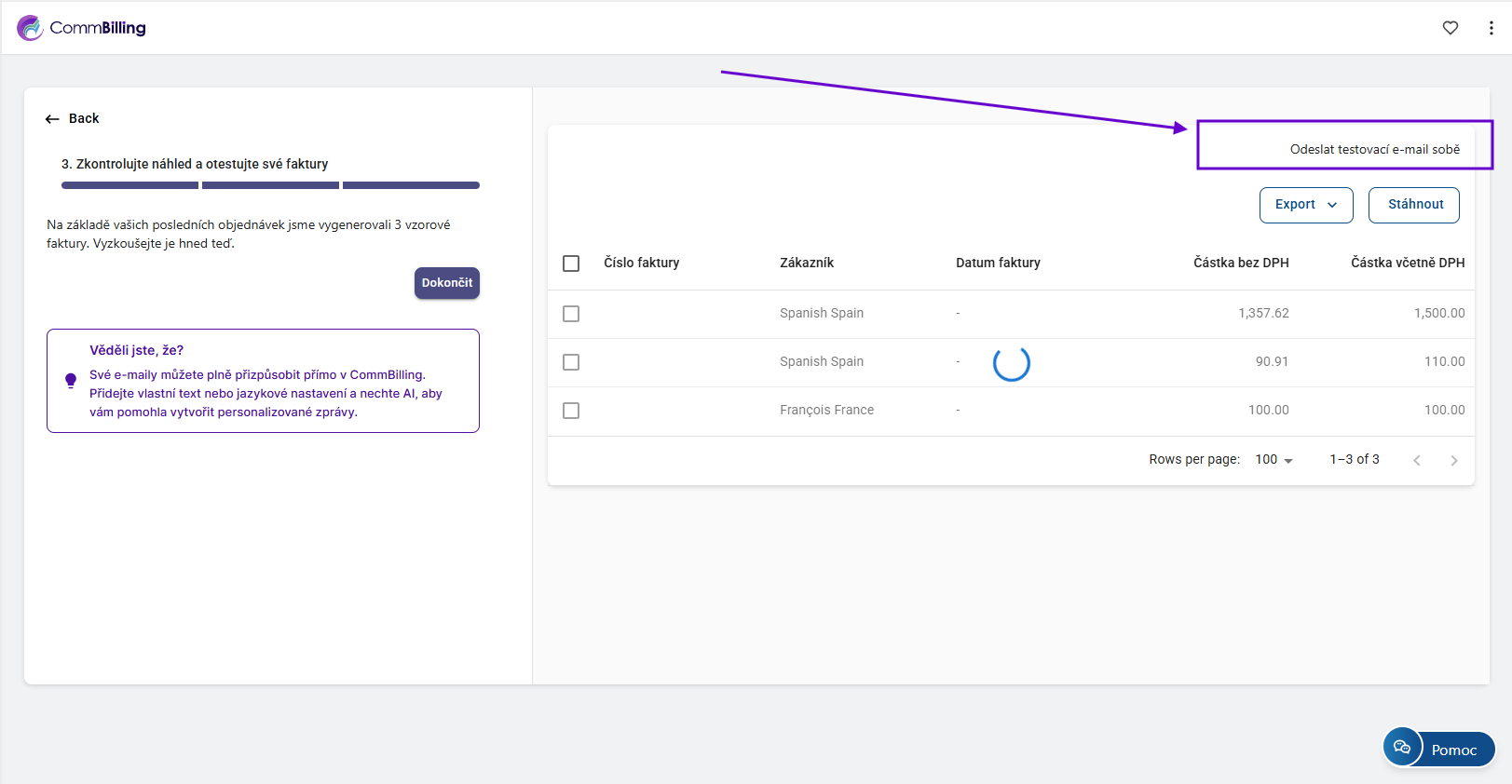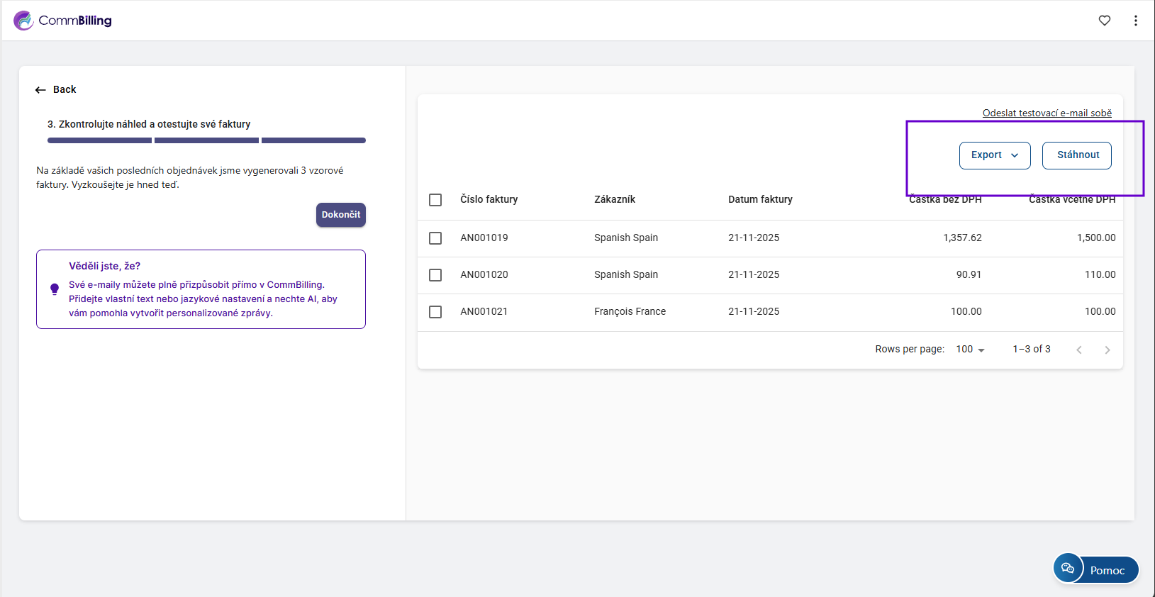 Vaše rychlé nastavení je nyní dokončeno a vaše fakturační aplikace je připravena k použití. Nyní můžete začít vytvářet faktury s výhodou že CommBilling automaticky vygeneruje tři faktury zdarma v rámci onboardingového procesu. Další přizpůsobení lze kdykoliv provést na kartě Nastavení.