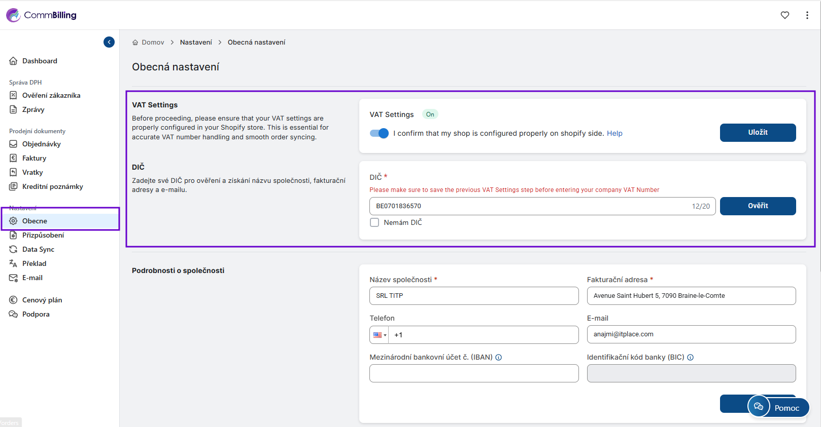 Nastavení Obecných nastavení je nezbytným krokem pro zajištění souladu přesnosti a efektivity provozu. Po dokončení tohoto nastavení může CommBilling správně synchronizovat vaše objednávky ověřit informace o DPH a použít konzistentní údaje napříč všemi prodejními dokumenty. Tento základ zajišťuje hladký a profesionální fakturační proces od samého začátku.