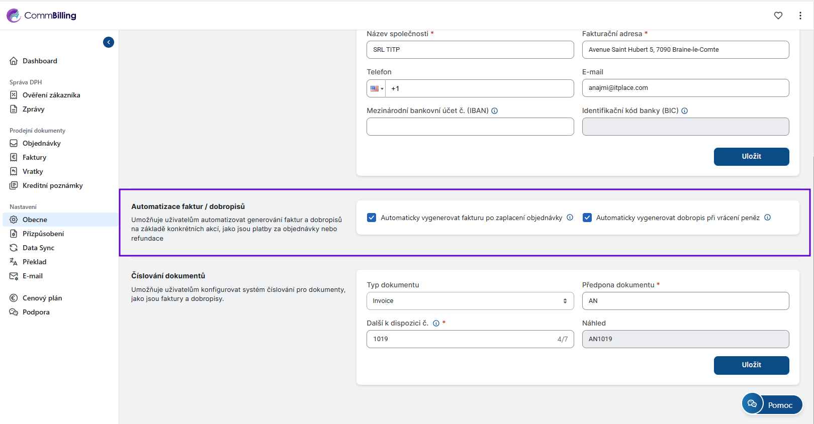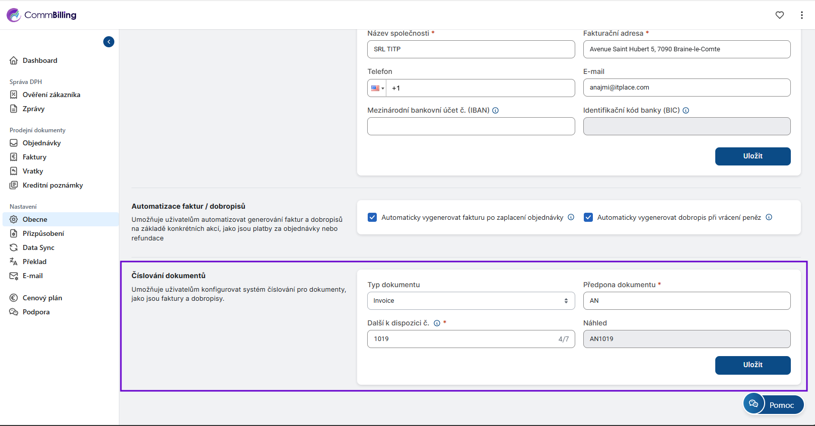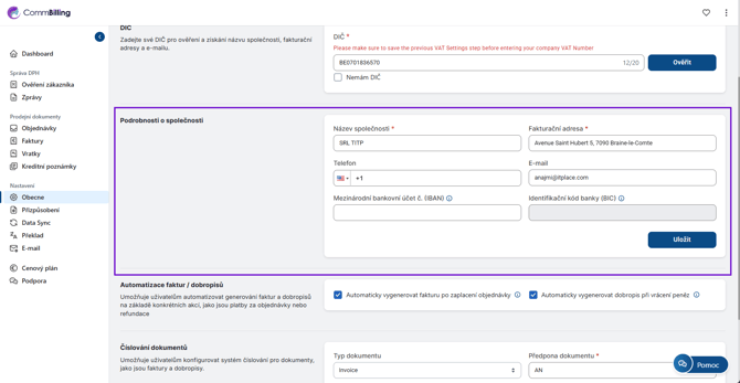 Sekce Obecná nastavení je základem celé konfigurace CommBilling. Zajišťuje že informace o vaší společnosti ověření DPH číslování dokumentů a automatizační pravidla jsou správně nastavena ještě předtím než začnete vytvářet faktury nebo dobropisy. Správná konfigurace v této sekci zaručuje přesnost soulad s předpisy a hladký každodenní provoz.