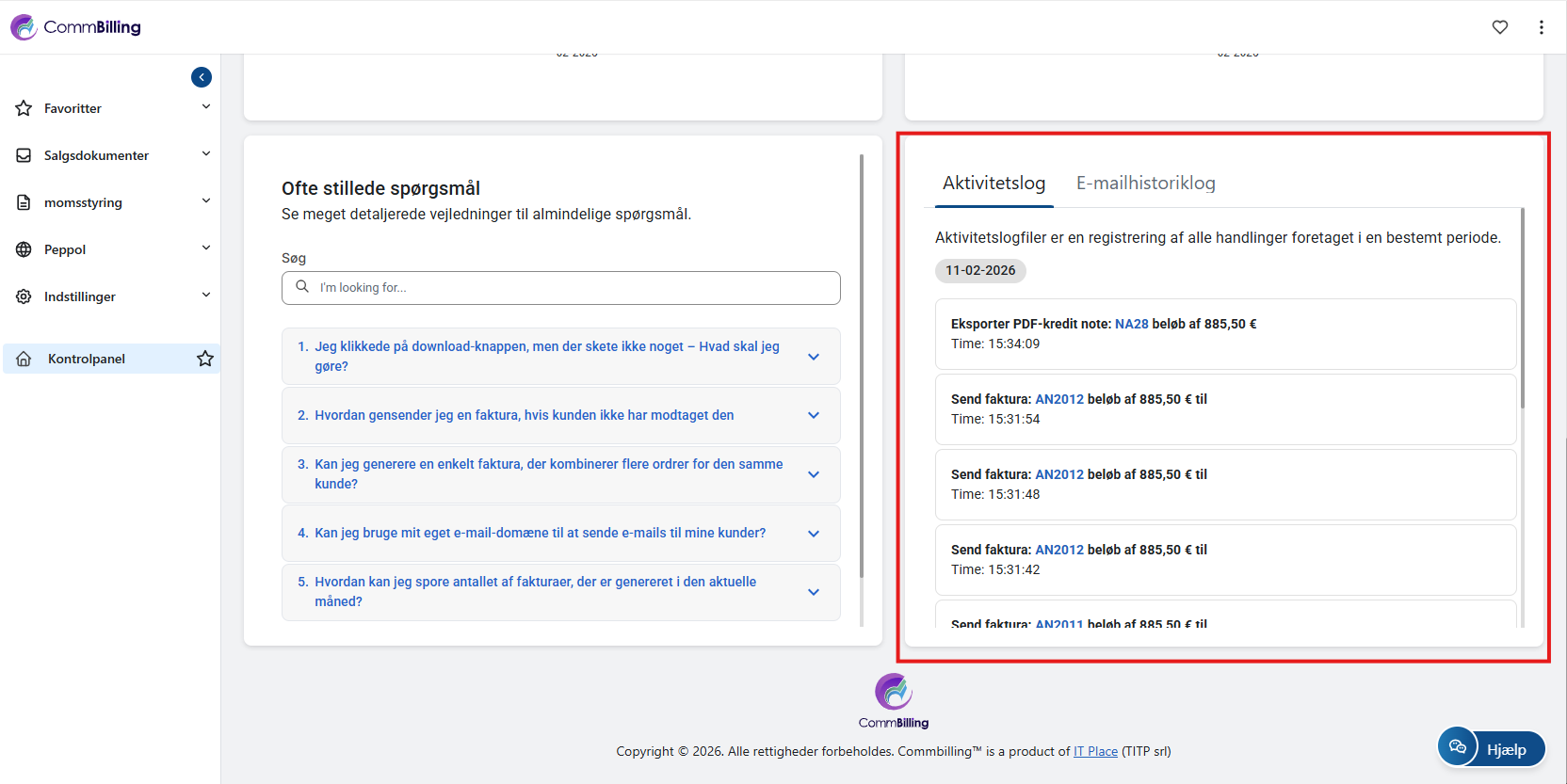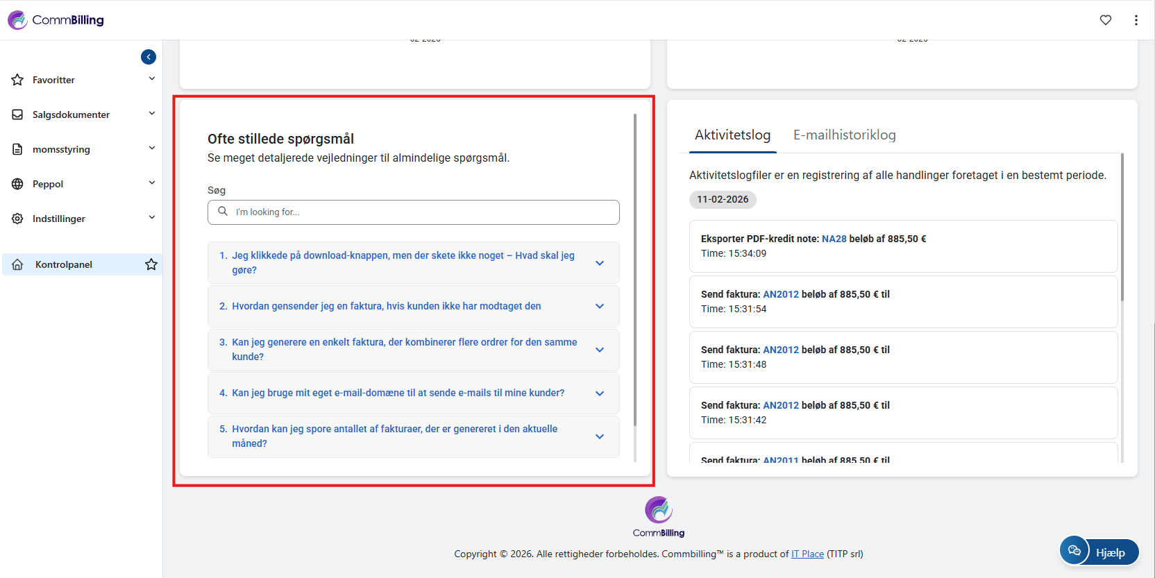 FAQ-afsnittet giver hurtig adgang til ofte stillede spørgsmål, artikler og vejledninger. Her finder du løsninger på almindelige problemer, tips til at maksimere CommBillings funktioner og fejlfindingsråd. Dette afsnit opdateres løbende for at sikre, at du har den support, du har brug for, lige ved hånden.