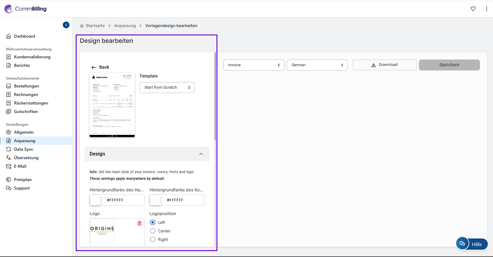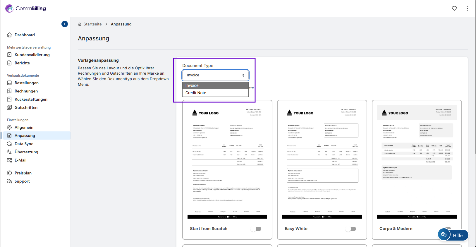 Durch die Anpassung Ihrer Verkaufsdokumente in CommBilling stellen Sie sicher dass jede Rechnung Gutschrift oder Rückerstattung die Professionalität und das Branding Ihres Unternehmens widerspiegelt. Diese Flexibilität hilft Ihnen klare konsistente und gut gestaltete Dokumente bereitzustellen die Ihre Kommunikation mit Kunden stärken.
