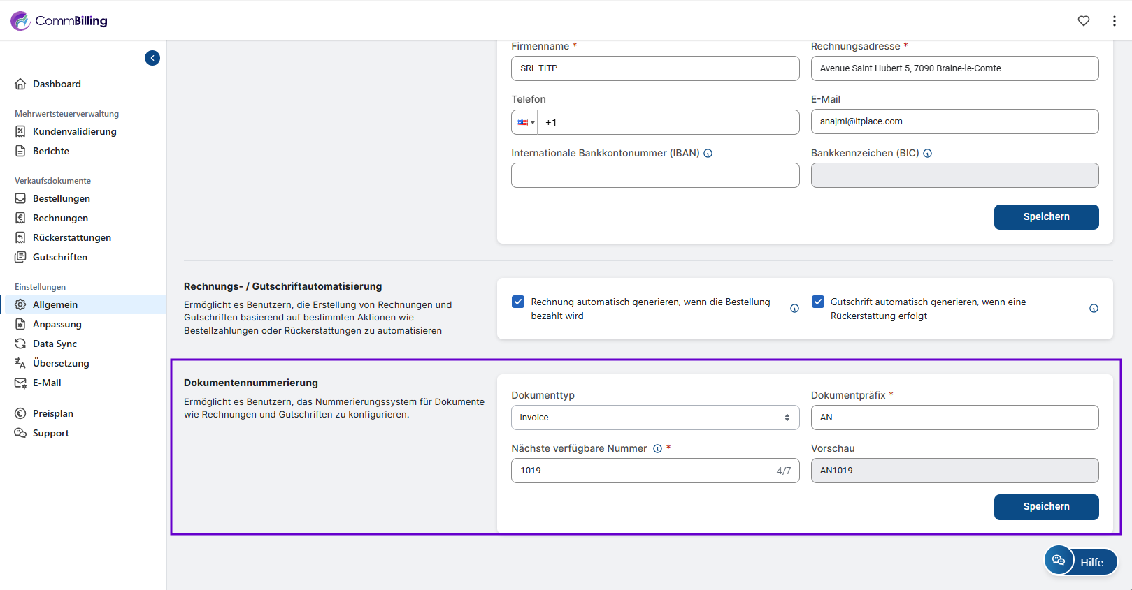 Der Abschnitt Allgemeine Einstellungen bildet die Grundlage Ihrer CommBilling Konfiguration. Er stellt sicher dass Ihre Unternehmensinformationen die Umsatzsteuer Validierung die Dokumentnummerierung und die Automatisierungsregeln korrekt eingerichtet sind bevor Sie mit der Erstellung von Rechnungen oder Gutschriften beginnen. Eine korrekte Einrichtung in diesem Bereich garantiert Genauigkeit Compliance und einen reibungslosen täglichen Betrieb.