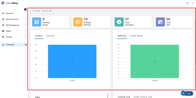 When you first open the Dashboard Tab, you will be greeted with a welcome section that introduces CommBilling. This section provides a quick overview of the application and how it helps you stay compliant with EU tax regulations. It’s designed to give you confidence in knowing that your billing processes are in good hands, with all features readily accessible for efficient order management.