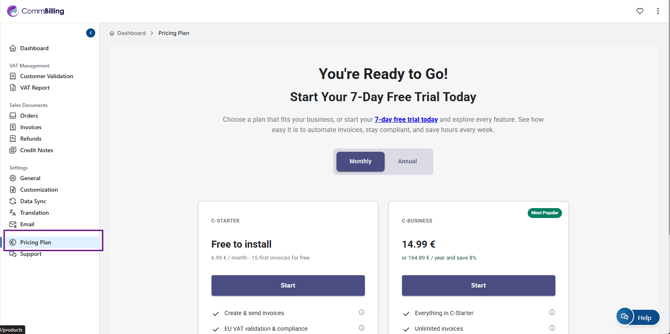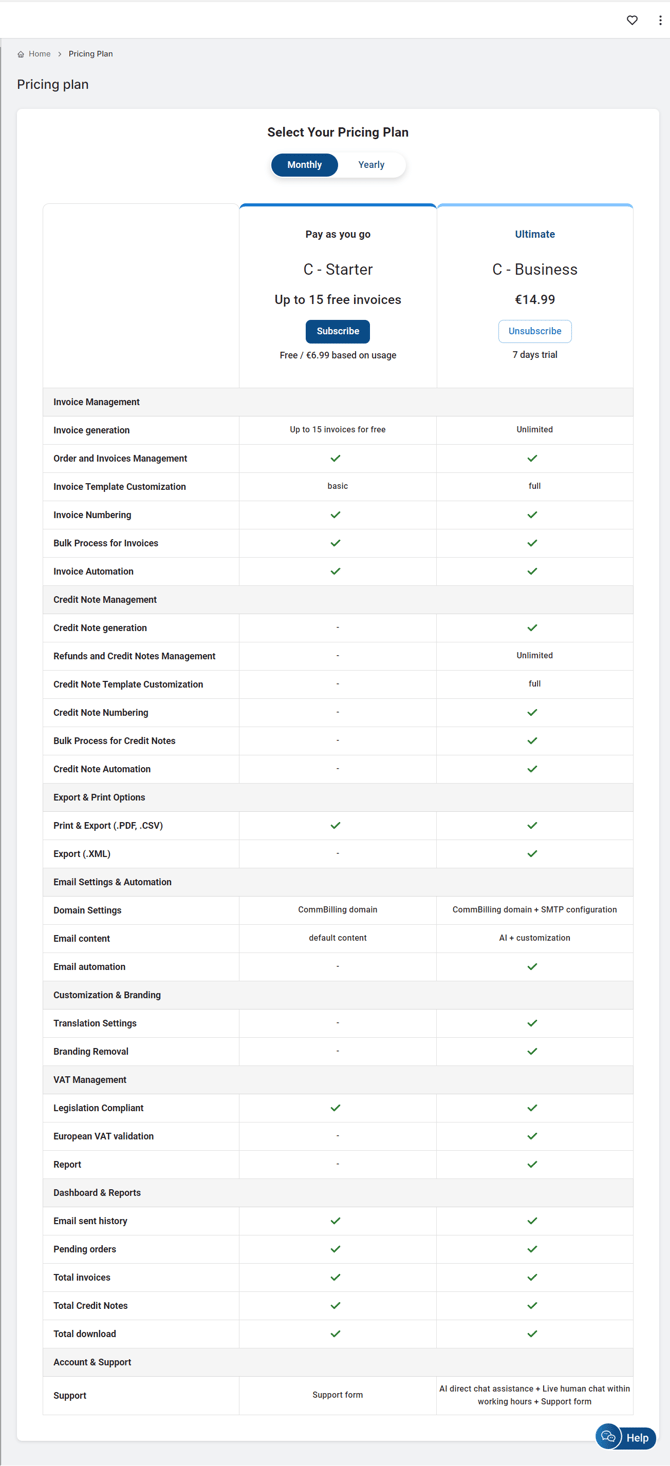 The Pricing Plan tab in CommBilling provides a clear and detailed overview of the available subscription options. It helps you compare the C Starter and C Business plans, activate your subscription, and manage any future changes. This section ensures that you can easily select the plan that best matches your operational and billing needs.