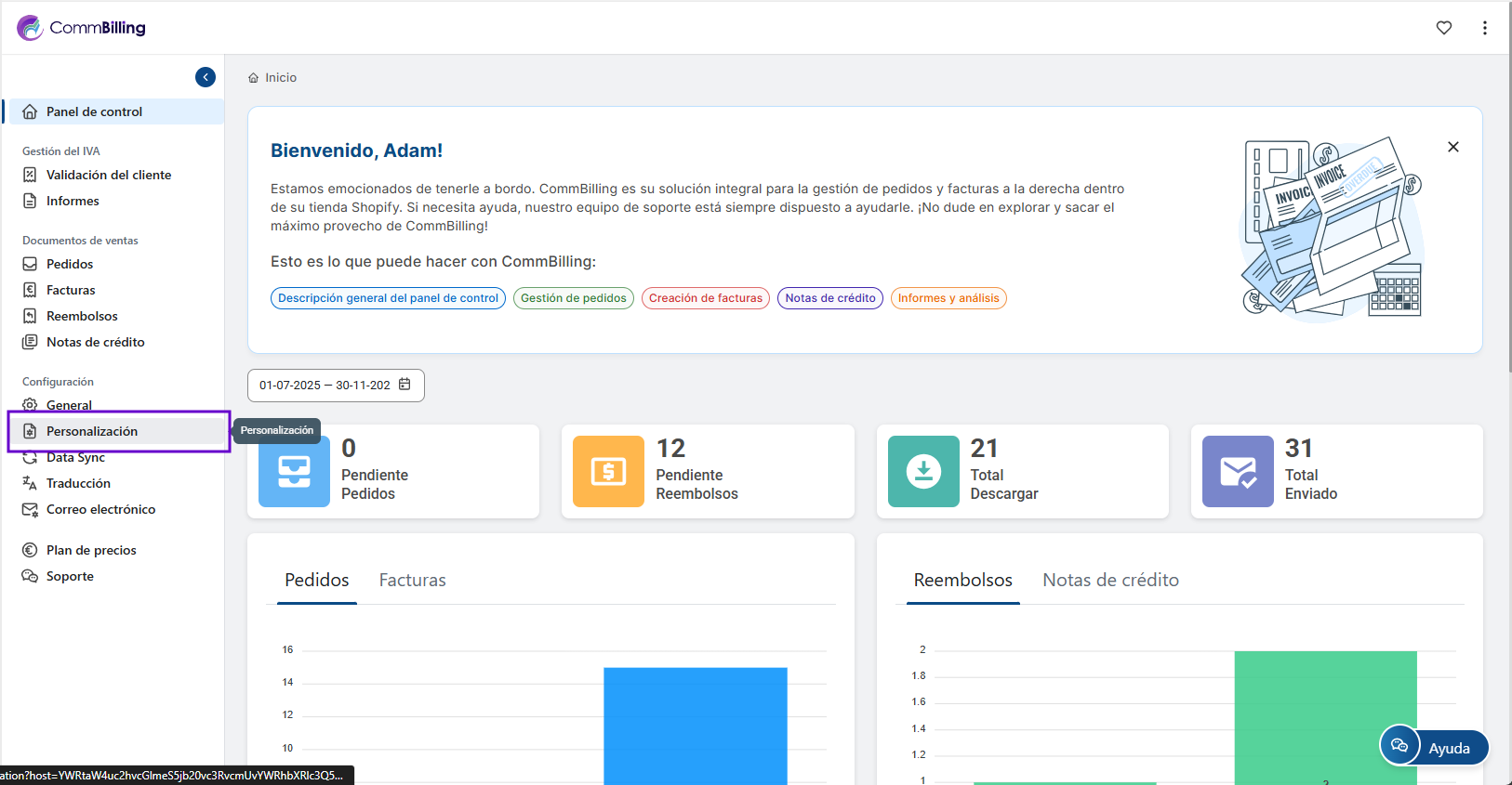 - Paso 1: Ve a la sección de configuración en CommBilling y selecciona la pestaña Personalización en el menú.
