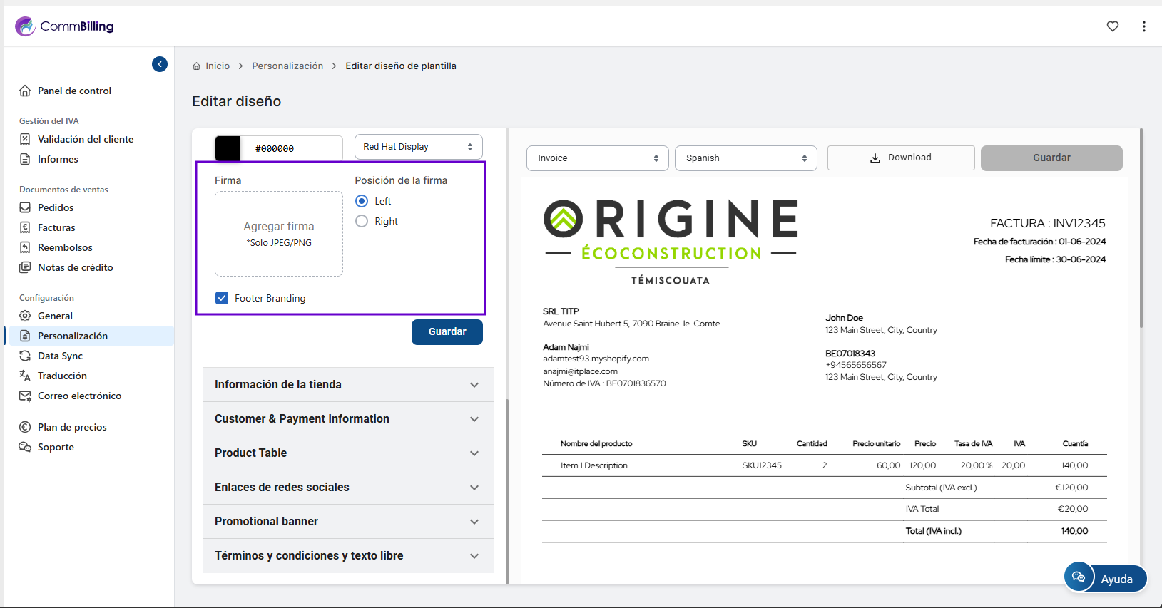 Agregar tu firma a las facturas refuerza la identidad de tu empresa y genera confianza en los clientes al dar a cada documento un toque personal y auténtico. En CommBilling esta función simplifica el proceso de insertar tu firma directamente en la plantilla de la factura garantizando que cada documento esté alineado con la imagen y los estándares de comunicación de tu empresa.