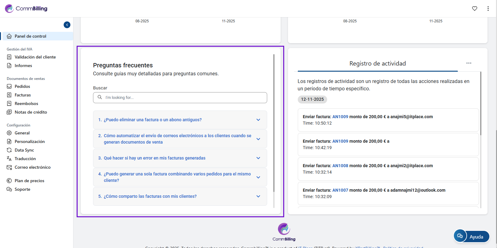 La sección FAQ (Preguntas Frecuentes) ofrece acceso rápido a preguntas frecuentes, artículos y guías. Aquí encontrarás soluciones a problemas comunes, consejos sobre cómo aprovechar al máximo las funciones de CommBilling y orientación para la resolución de problemas. Esta sección se actualiza constantemente para garantizar que tengas el soporte necesario al alcance de tu mano.