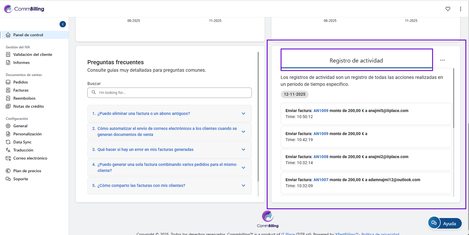 El Registro de actividad ofrece un registro detallado de todas las actividades realizadas en CommBilling. Desde la generación de facturas hasta la edición de plantillas de documentos, cada acción queda registrada. Esto facilita el seguimiento de qué cambios se hicieron y por quién, brindándote total visibilidad de tus operaciones de facturación. Es especialmente útil para auditorías y para revisar acciones en caso de que surjan problemas.