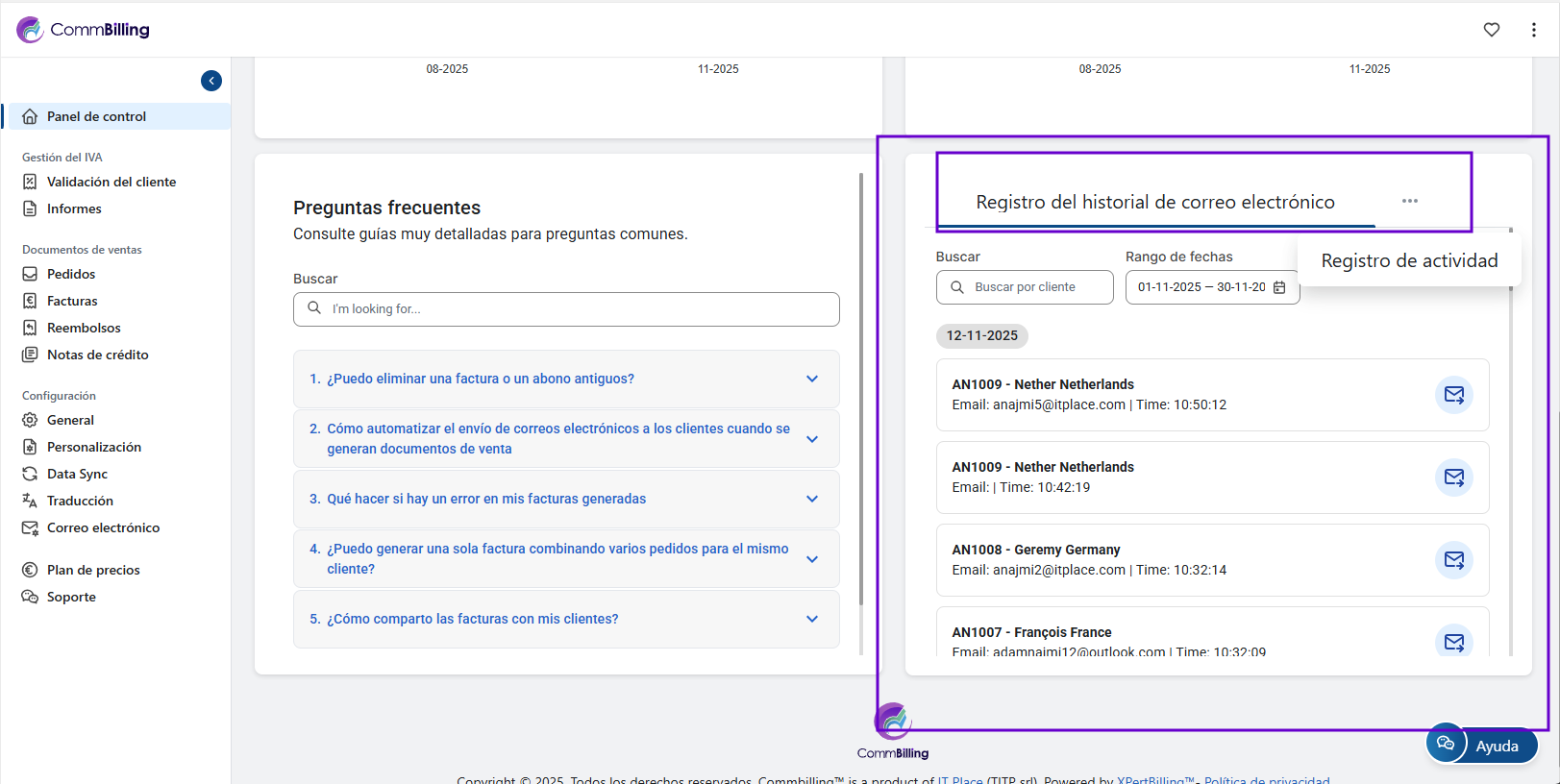 El Registro del historial de correos electrónicos te permite supervisar todos los correos salientes relacionados con la facturación, incluidas las facturas, las notas de crédito y los recordatorios de pago. Puedes seguir el estado de cada correo (por ejemplo, enviado, entregado o fallido) y asegurarte de que tus clientes reciban sus documentos de facturación a tiempo. Esta sección te ofrece tranquilidad al proporcionarte un registro completo de la comunicación entre tú y tus clientes.