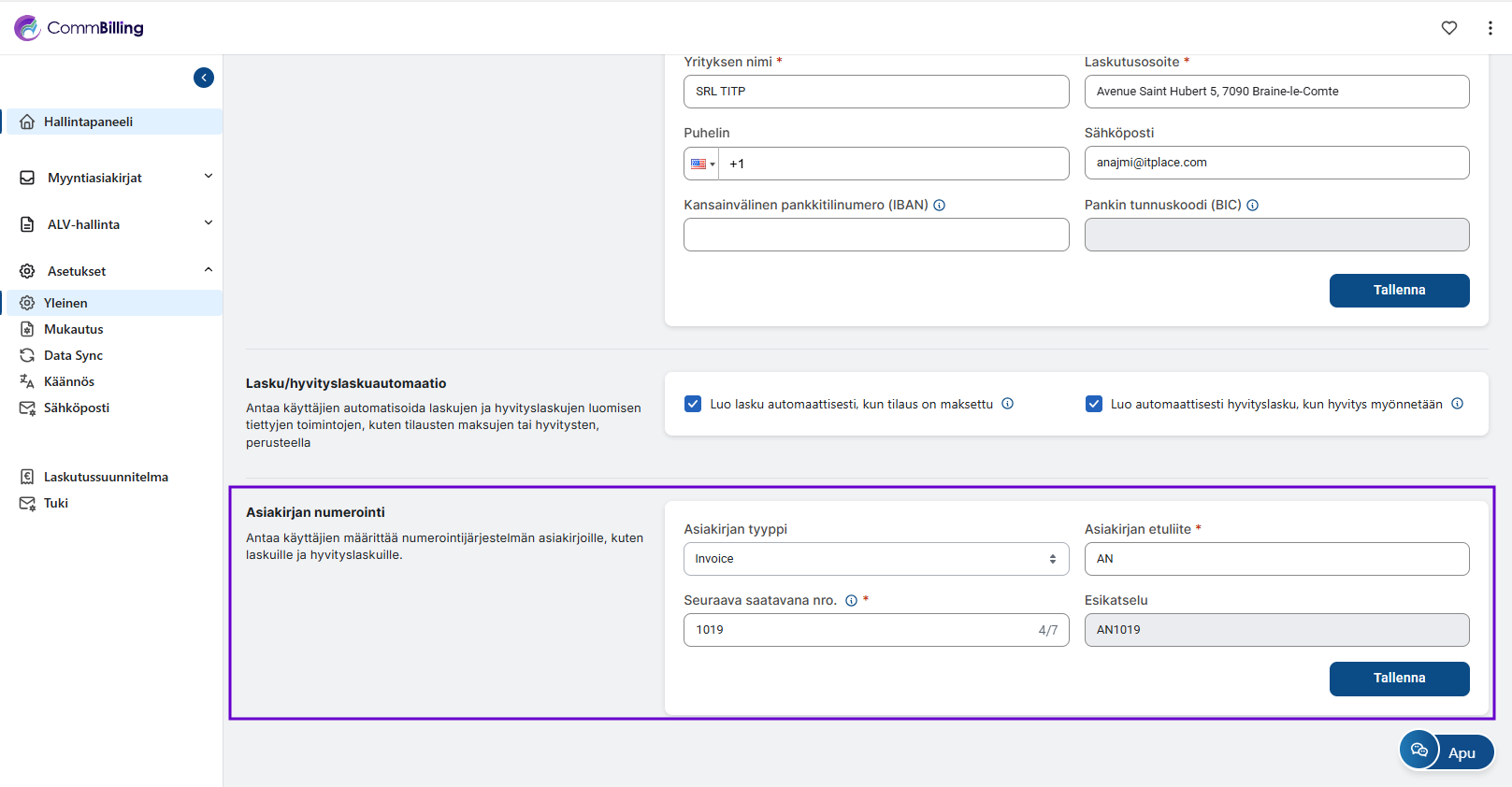 Tämän osion avulla voit määrittää asiakirjojen, kuten laskujen ja hyvityslaskujen, numerointijärjestelmän. Selkeä ja mukautettava numerointijärjestys varmistaa johdonmukaisuuden ja auttaa asiakirjojen järjestämisessä ja seurannassa.