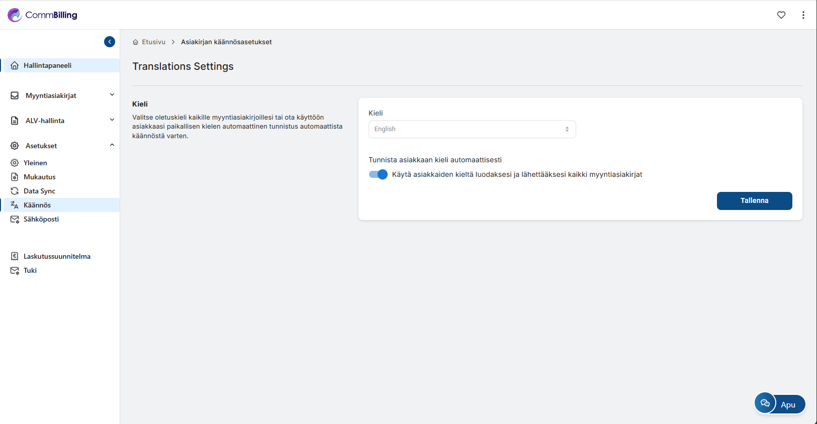Käännös-alavälilehdellä CommBilling tunnistaa Shopify-kaupassasi käytetyn kielen ja säätää käyttöliittymää sen mukaisesti. Voit tarvittaessa muuttaa kieliasetuksia manuaalisesti.