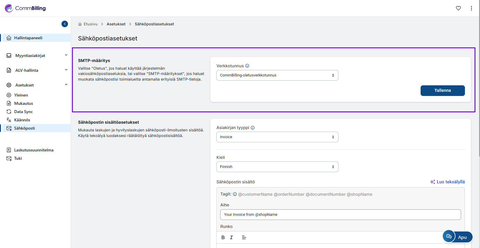 • SMTP-määritys: Suunnitelmastasi riippuen voit joko käyttää CommBillingin SMTP-palvelinta tai määrittää oman, jolloin voit hallita, miten laskut, hyvityslaskut ja muu viestintä lähetetään.