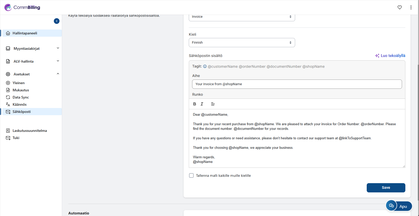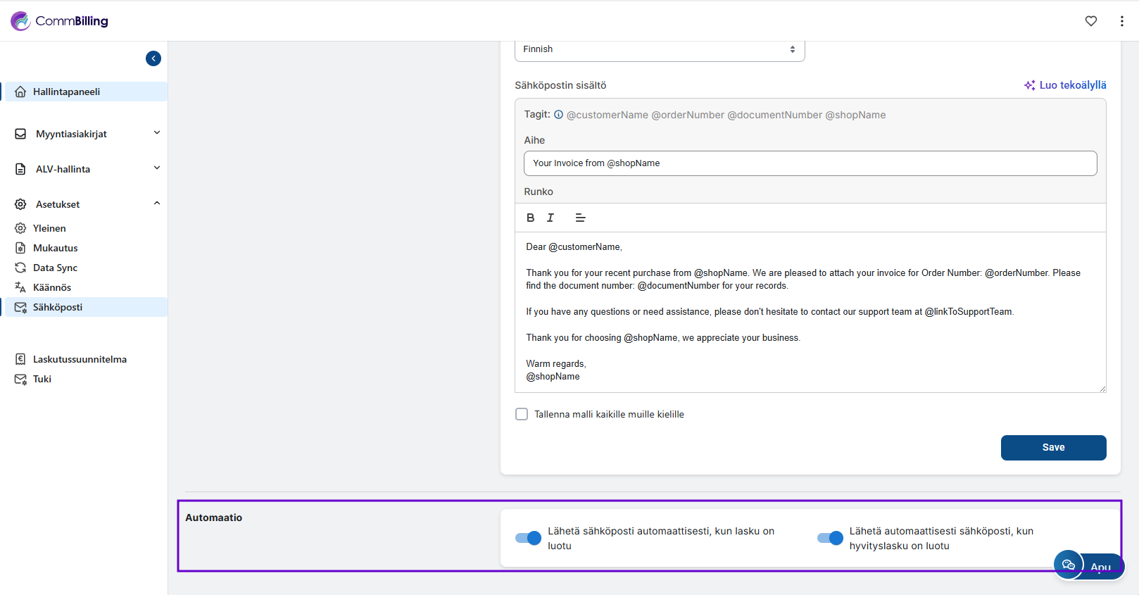 • Automatisointi: Automatisoi sähköpostien lähetysprosessi, kun laskut tai hyvityslaskut luodaan, mikä varmistaa oikea-aikaisen viestinnän ilman manuaalista puuttumista.