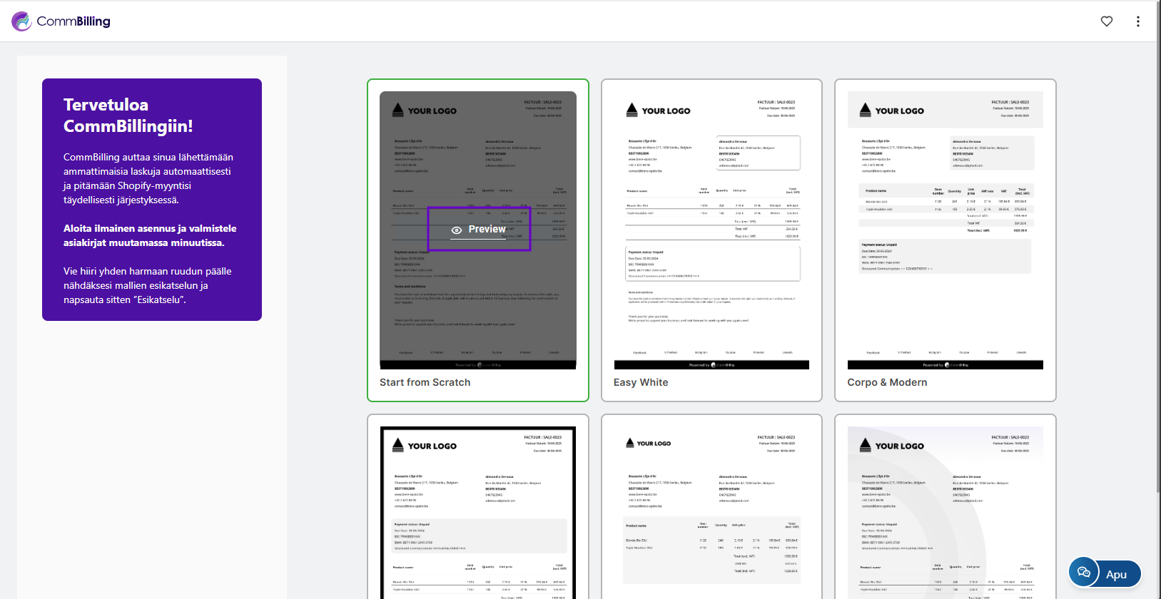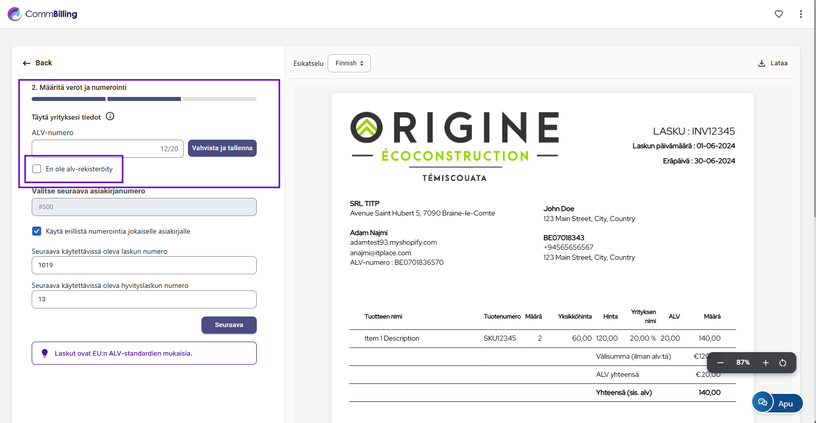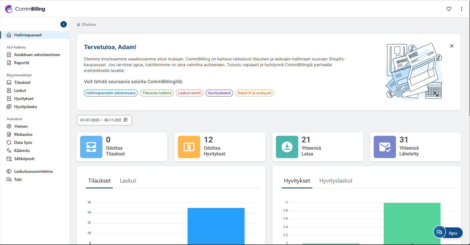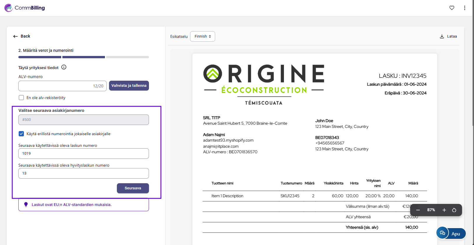 CommBillingin oikea käyttöönotto varmistaa tarkan ALV käsittelyn, sujuvan tilausten synkronoinnin, säädösten mukaisen laskutuksen ja täysin automatisoidun laskutusprosessin. Tämä alkuasetusten määrittely on välttämätön sen varmistamiseksi että myyntidokumentit, automaatiosäännöt ja ulkoasuasetukset toimivat saumattomasti Shopify kauppasi kanssa.