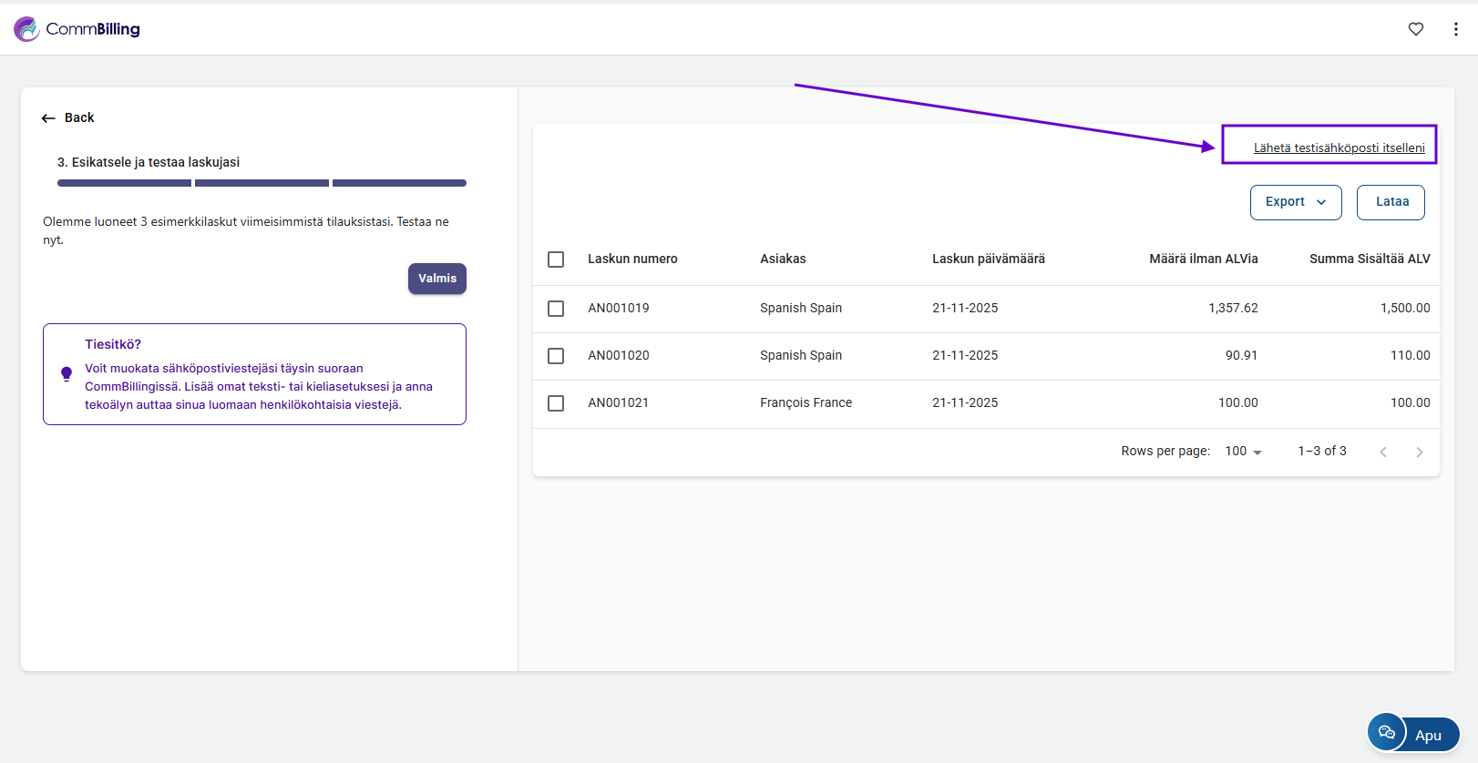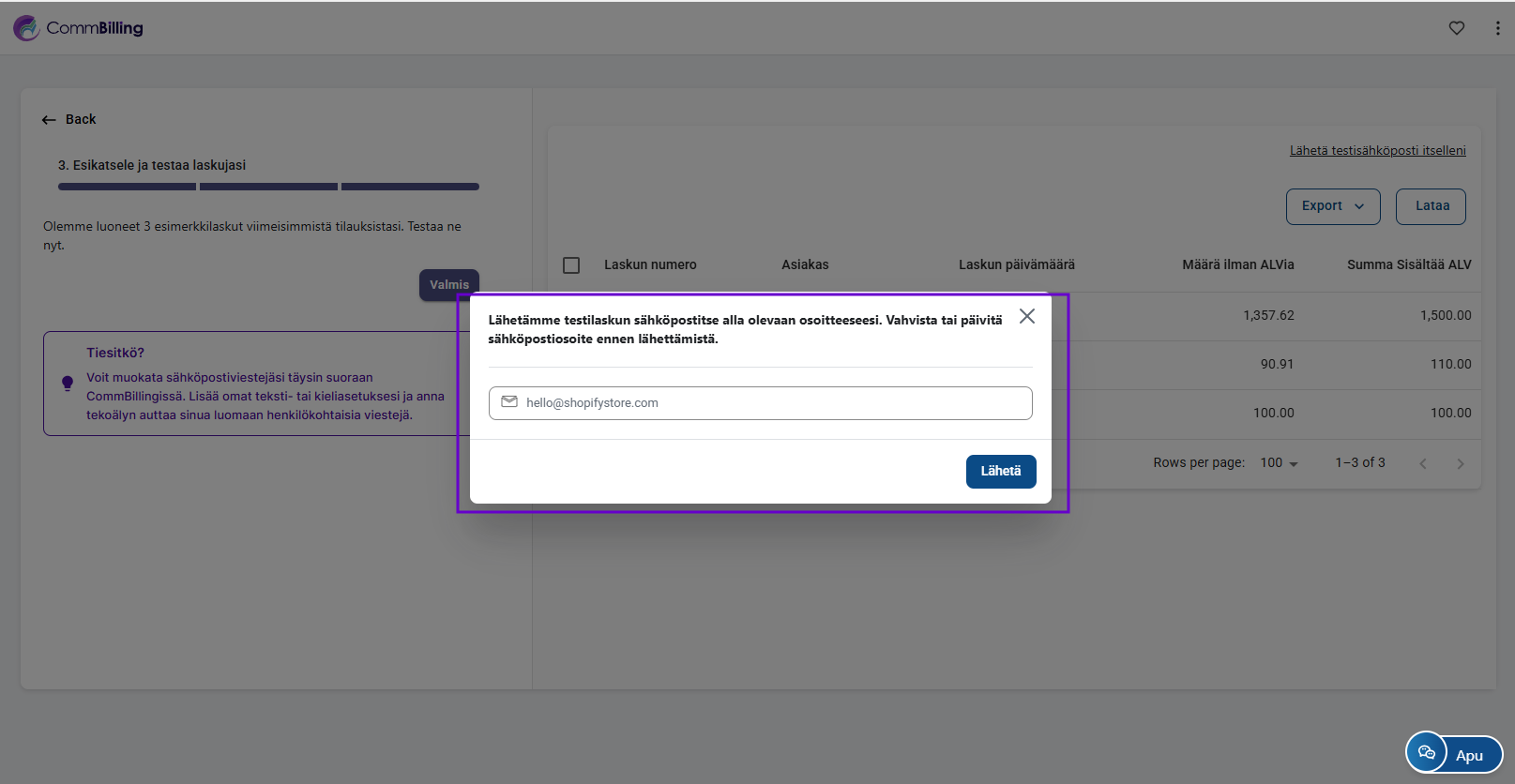 Nopea käyttöönotto on nyt valmis ja laskutussovelluksesi on käyttövalmis. Voit nyt aloittaa laskujen luomisen ja lisäksi CommBilling luo onboarding kokemuksen osana automaattisesti kolme ilmaista laskua. Lisämuokkauksia voidaan tehdä milloin tahansa Asetukset välilehdellä.