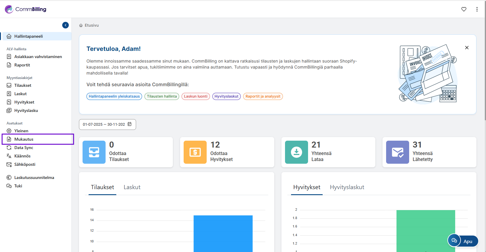 - Vaihe 1: Siirry CommBillingin asetuksiin ja valitse valikosta Mukautus välilehti.
