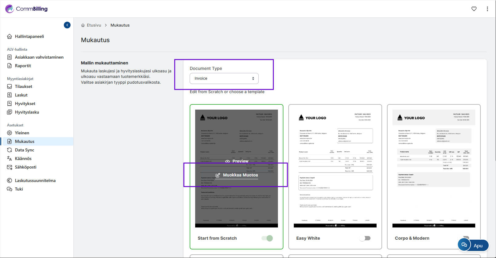 - Vaihe 2: Varmista että dokumenttityyppinä on Lasku ja vie hiiri valitsemasi mallin päälle. Napsauta sitten Muokkaa ulkoasua.