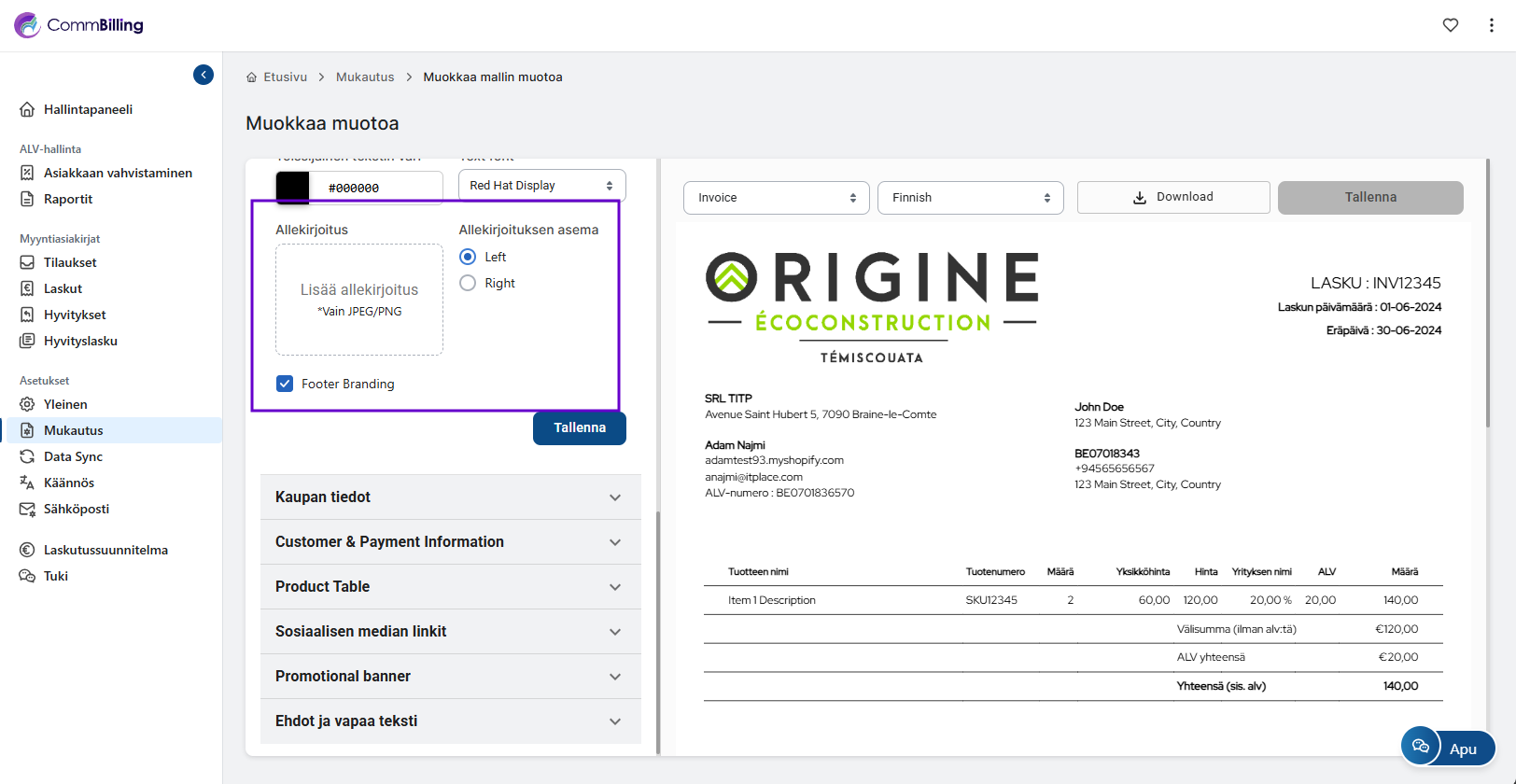 Allekirjoituksen lisääminen laskuihin vahvistaa yrityksesi brändiä ja lisää asiakkaiden luottamusta antamalla jokaiselle dokumentille henkilökohtaisen ja aidon vaikutelman. CommBillingissä tämä ominaisuus tekee allekirjoituksen upottamisesta suoraan laskupohjaan helppoa varmistaen että jokainen dokumentti vastaa yrityksesi ilmettä ja viestintästandardia.