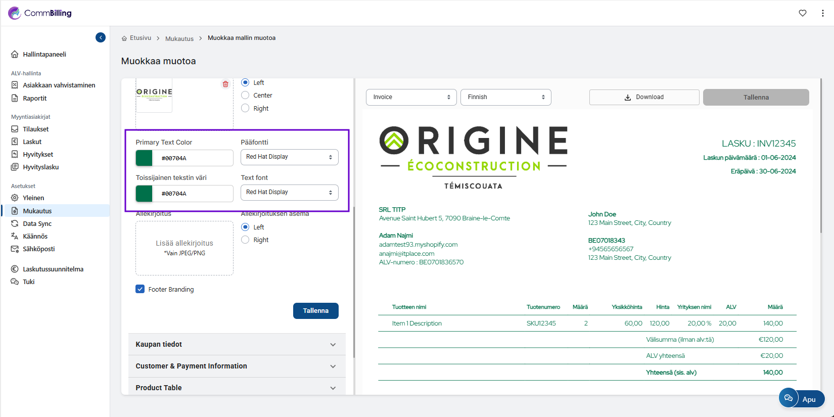 Laskujen fonttien mukauttaminen auttaa sinua ylläpitämään brändisi johdonmukaisuutta ja varmistamaan, että jokainen lähettämäsi asiakirja heijastaa yrityksesi visuaalista identiteettiä. CommBillingissä voit helposti säätää laskuissa käytettävää fonttityyliä niin, että se vastaa yrityksesi tyyliä ja suunnitteluprefenssejä, mikä luo ammattimaisemman ja henkilökohtaisemman ulkoasun.
