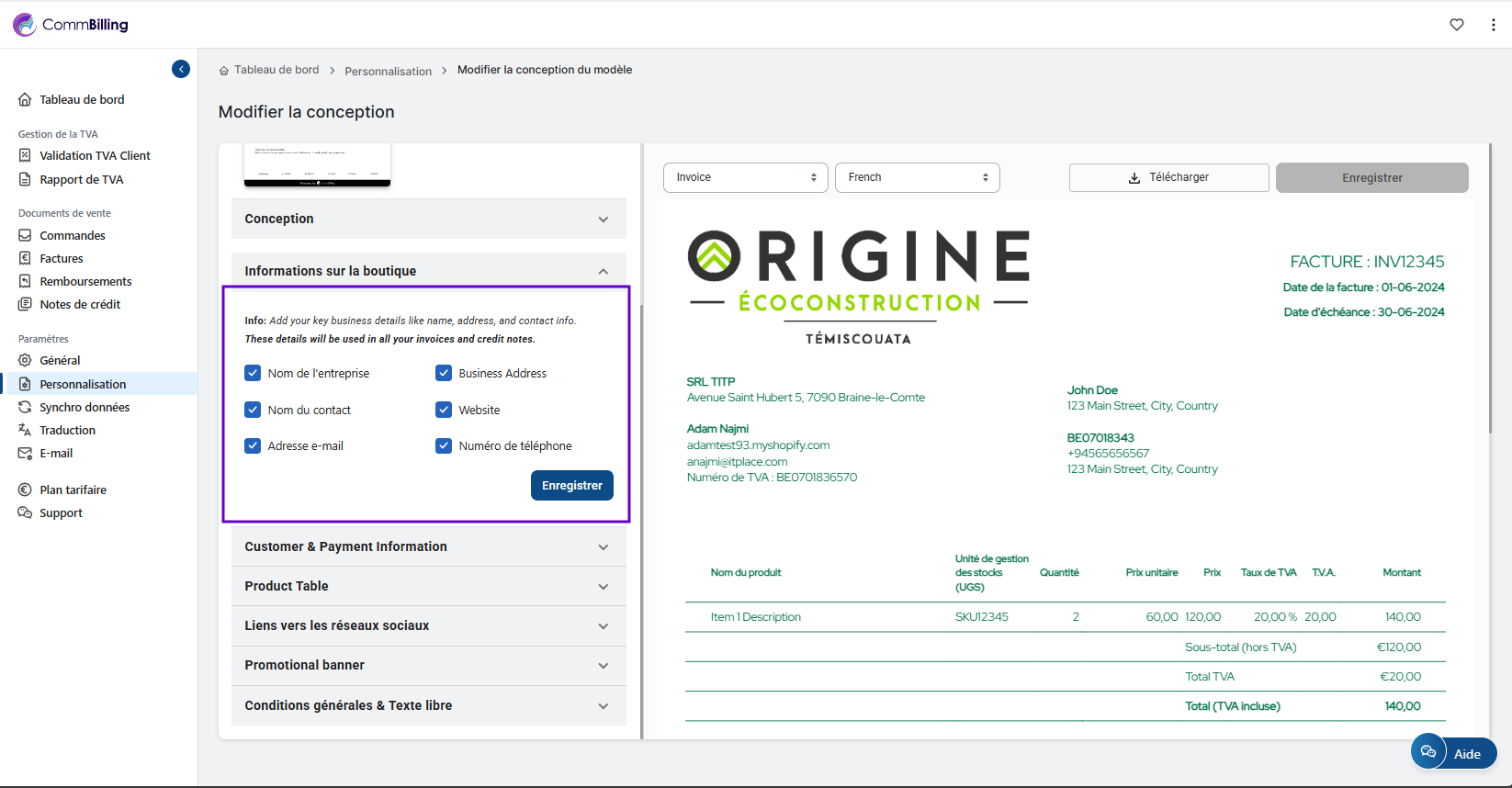 Vous pouvez personnaliser la visibilité des champs de facture directement depuis les paramètres de personnalisation.