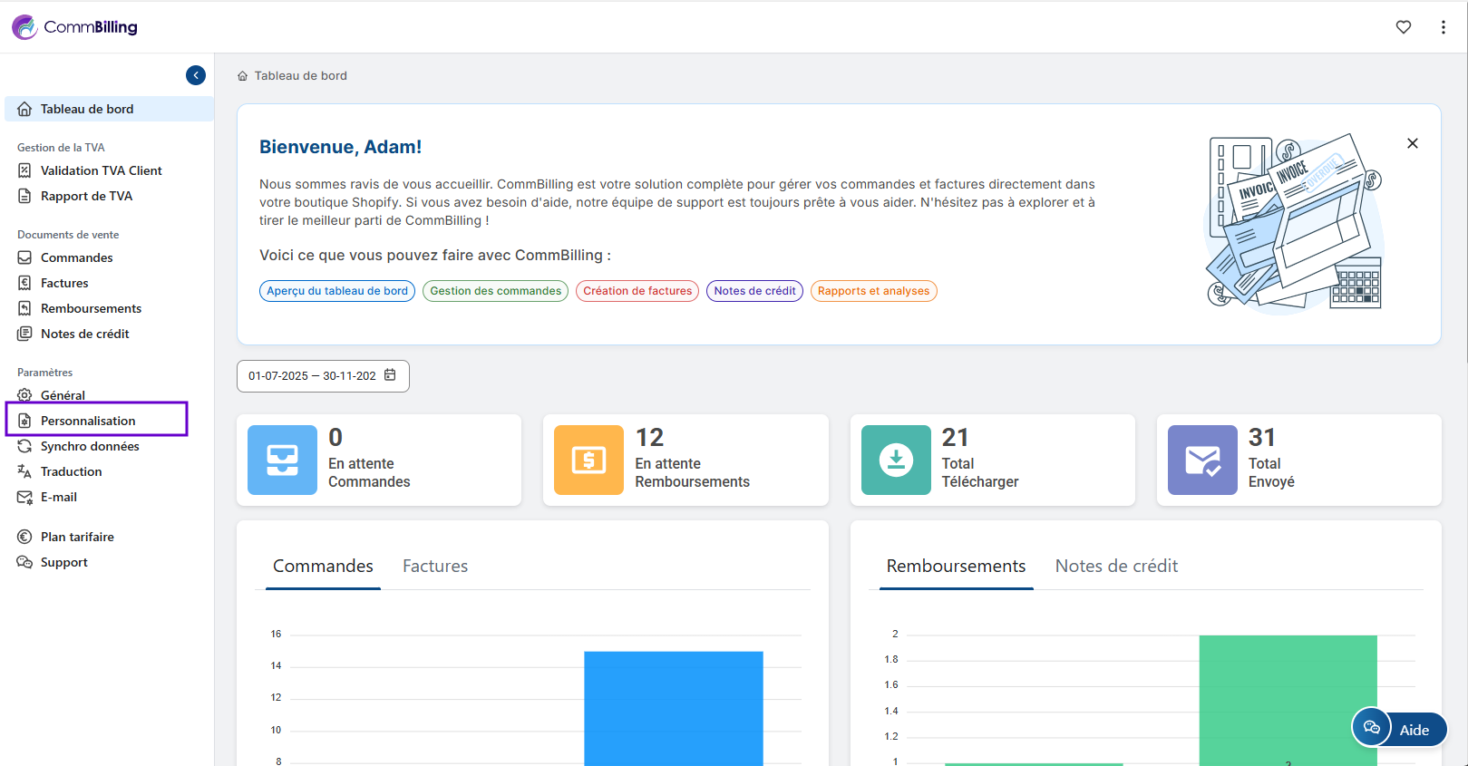 • Étape 1 : Accédez à la section Paramètres dans CommBilling et sélectionnez l'onglet Personnalisation dans le menu.