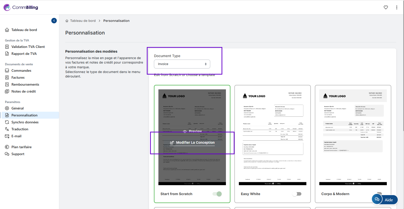 • Étape 2 : Choisissez le Modèle de Facture dans le type de modèle et cliquez sur le bouton Modifier la conception.