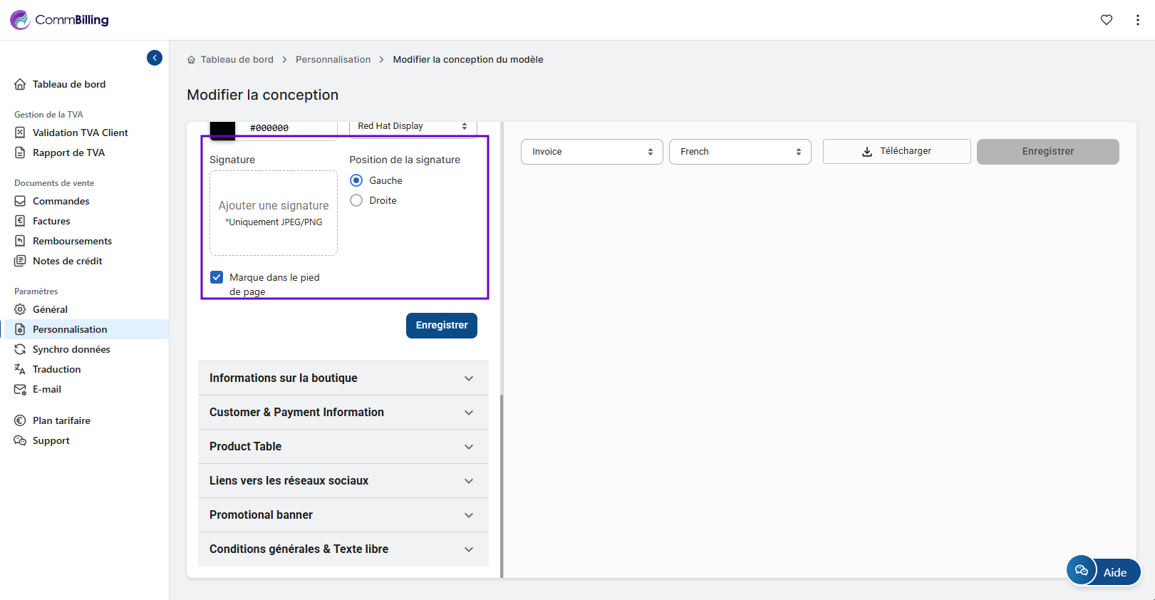 • Étape 5 : Utilisez l'aperçu pour vérifier le placement de votre signature. Une fois satisfait, cliquez sur Enregistrer pour appliquer les modifications à votre modèle de facture.