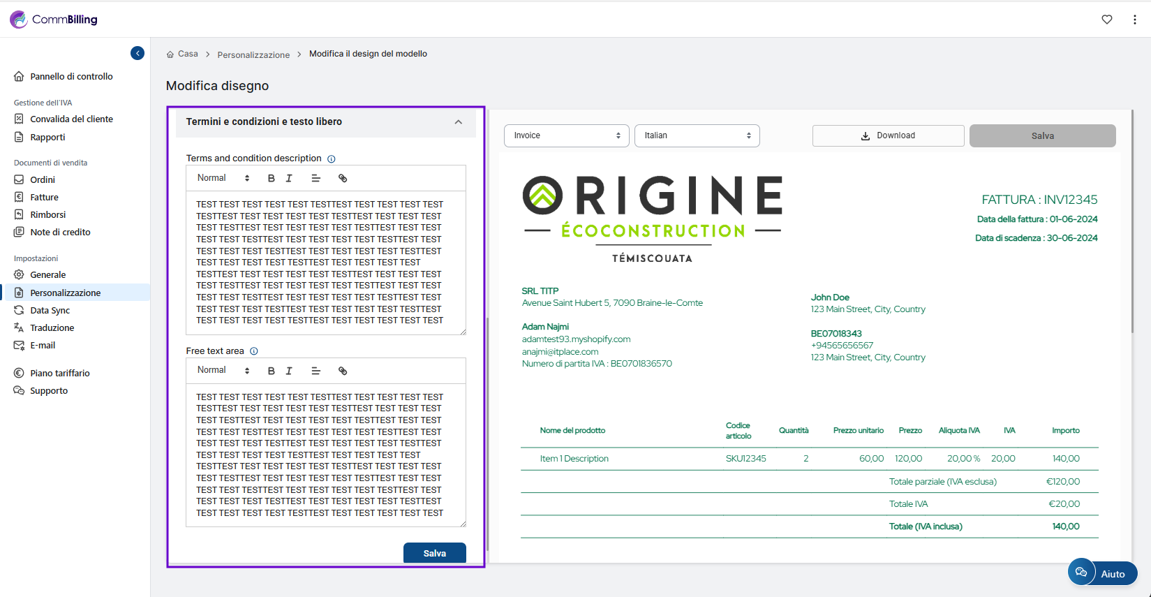 Aggiungendo note o condizioni personalizzate rendi le tue fatture più informative e professionali mantenendo allo stesso tempo trasparenza con i clienti. CommBilling ti permette di adattare facilmente queste sezioni aiutando la tua azienda a comunicare informazioni importanti in modo chiaro e coerente su ogni documento.