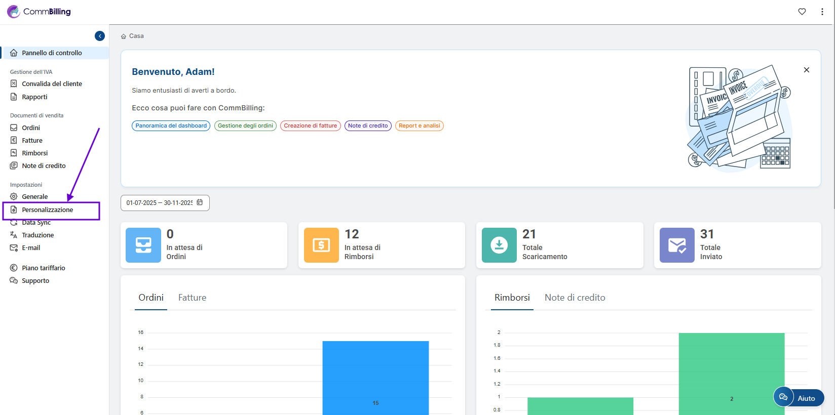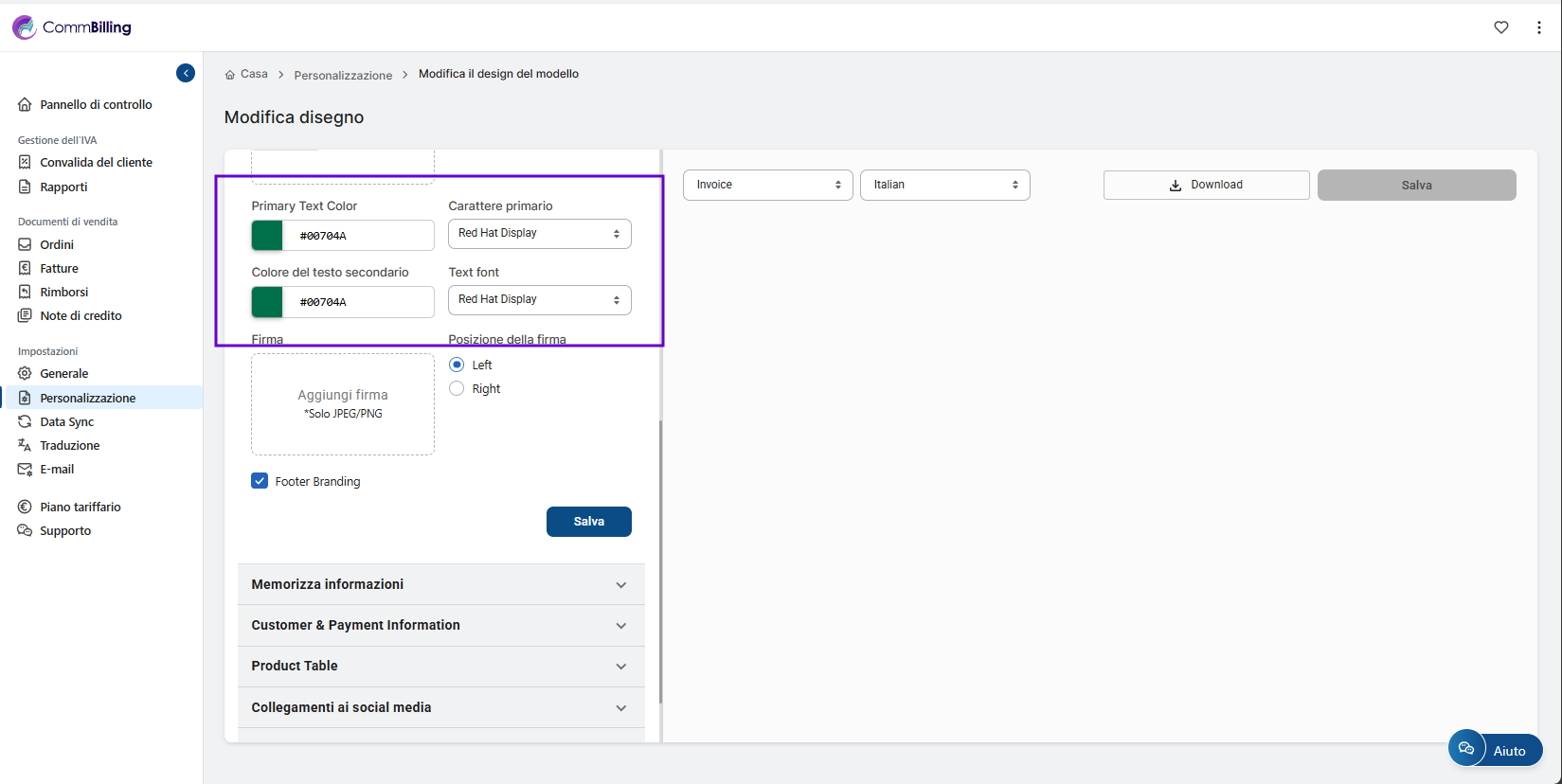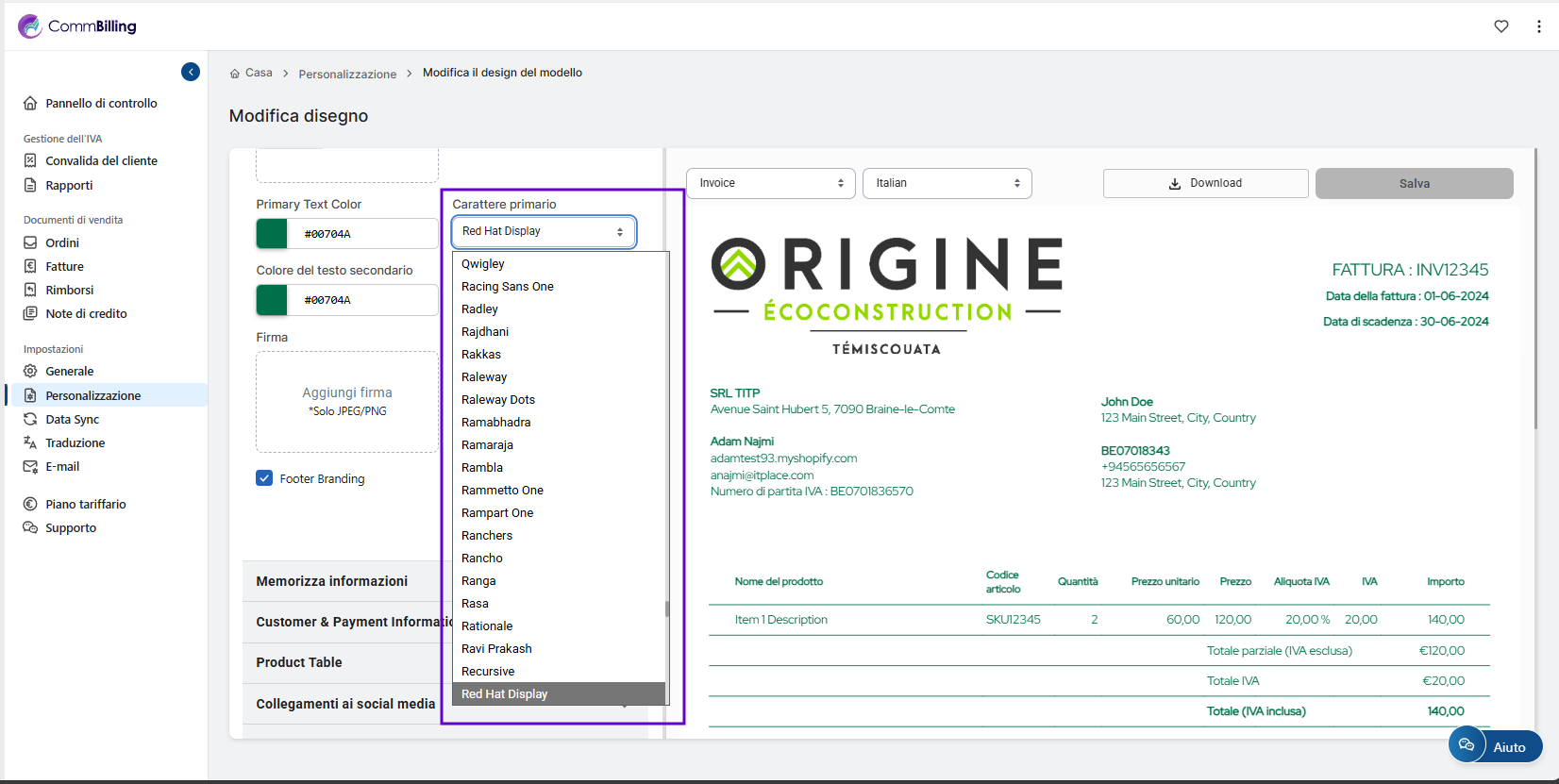 La personalizzazione dei caratteri delle tue fatture ti aiuta a mantenere la coerenza del brand e a garantire che ogni documento inviato rifletta l’identità visiva della tua azienda. In CommBilling puoi facilmente regolare lo stile del carattere utilizzato nelle fatture in modo che corrisponda al tono e alle preferenze di design della tua attività, creando un aspetto più professionale e personalizzato.