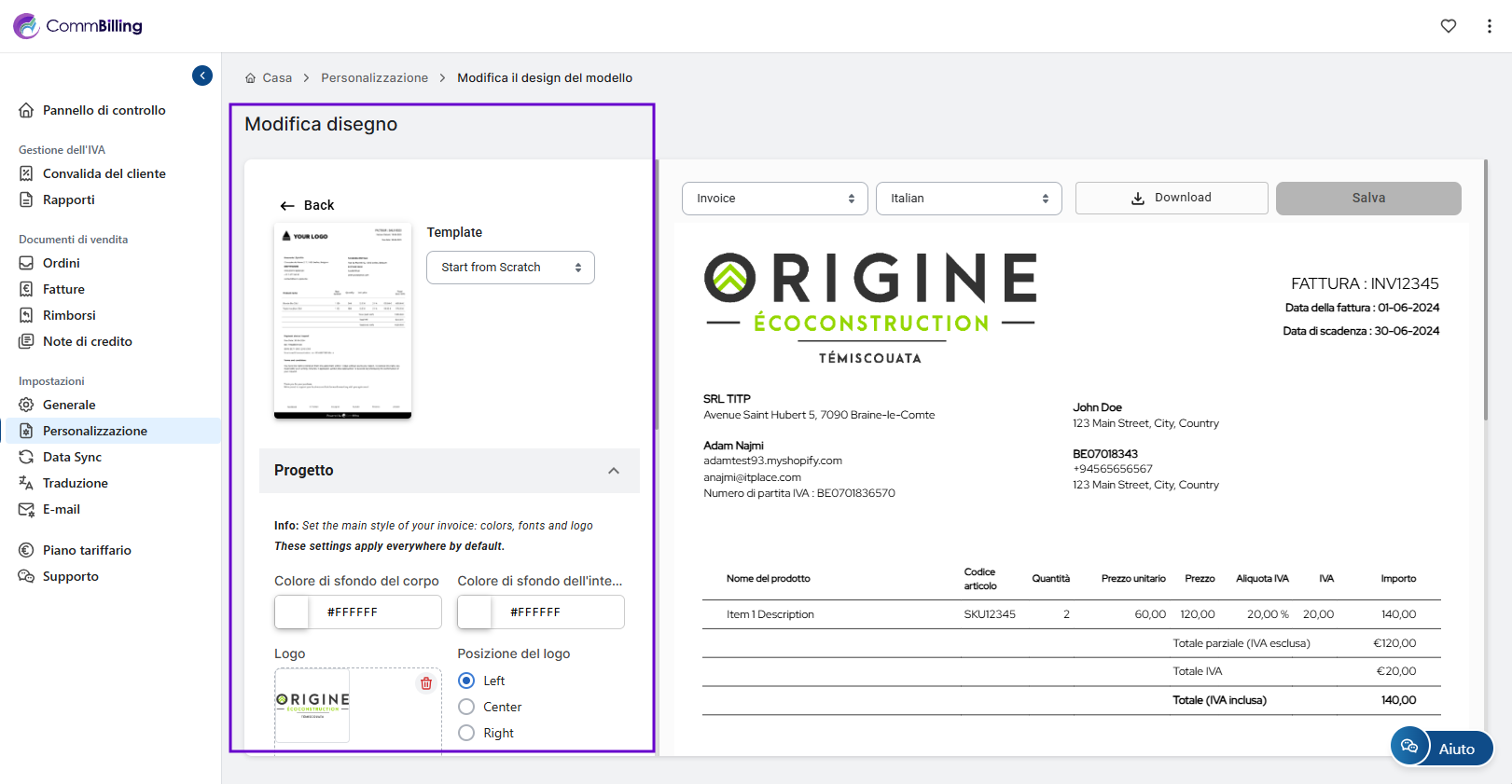 CommBilling offre opzioni di design flessibili così puoi adattare colori font campi ed elementi del brand per garantire che ogni documento inviato sia professionale e in linea con la tua identità visiva.