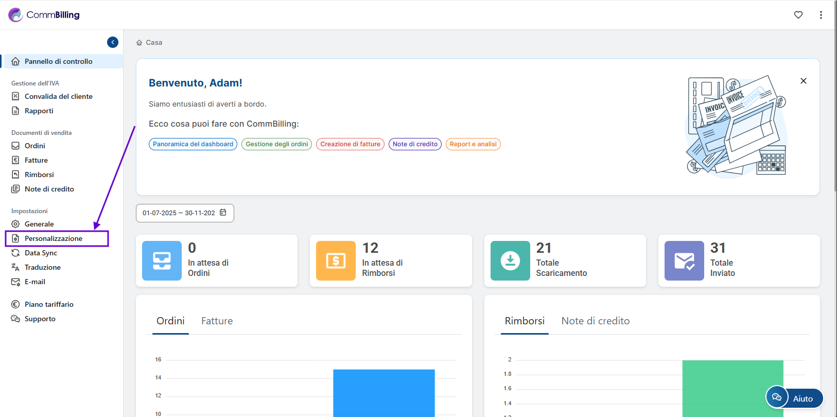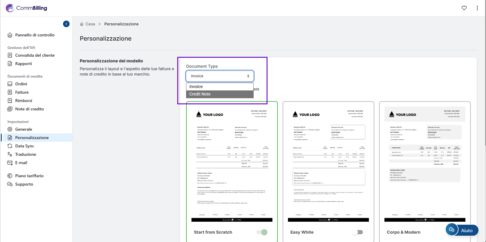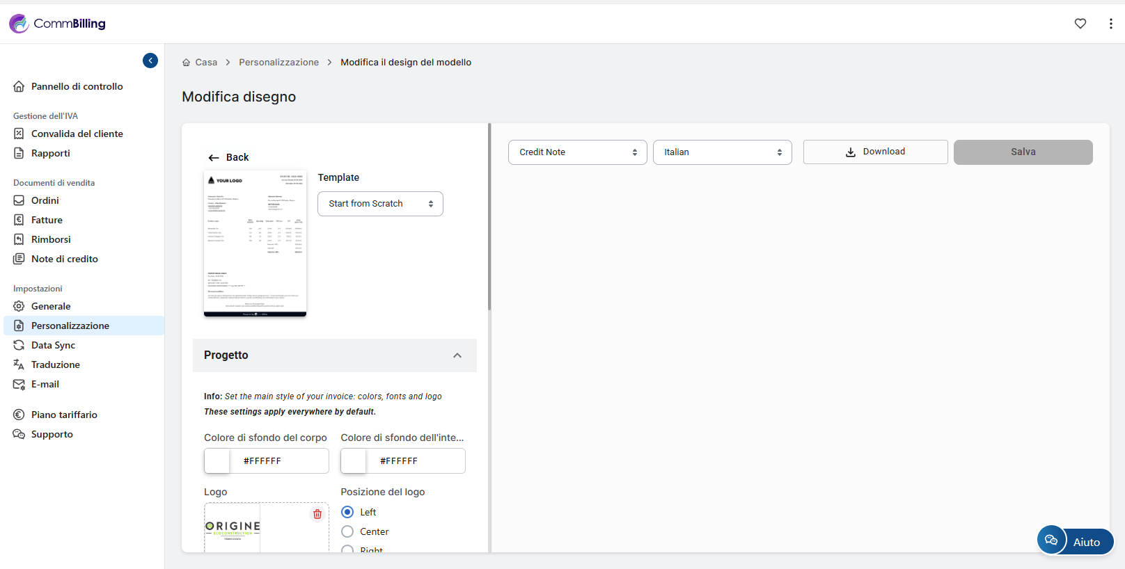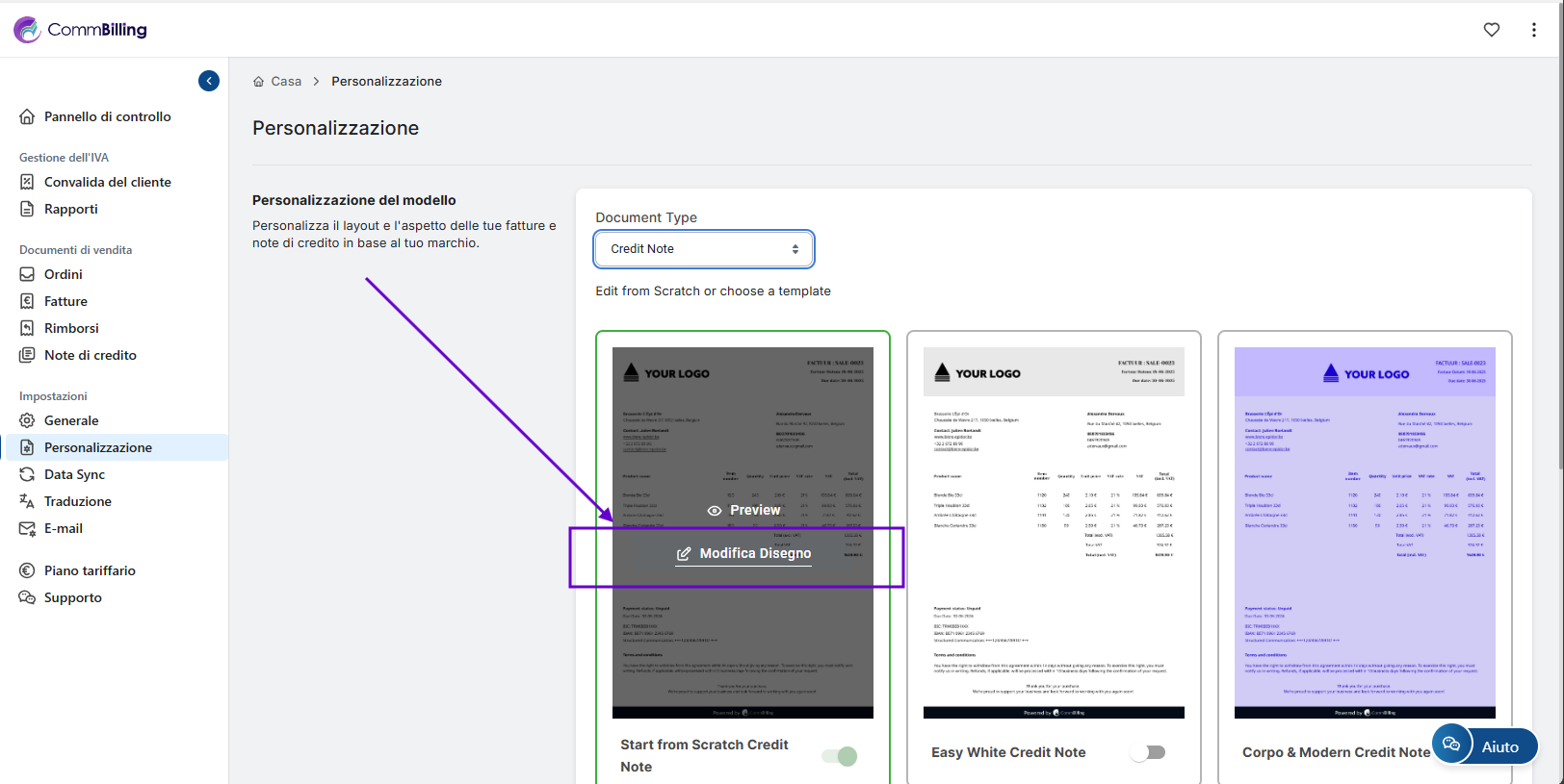 Puoi modificare il tuo modello di nota di credito direttamente dalle impostazioni di personalizzazione in CommBilling. Segui i passaggi riportati di seguito per aggiornare il design secondo le tue preferenze.