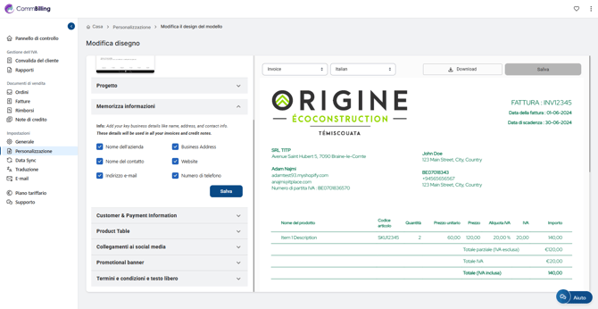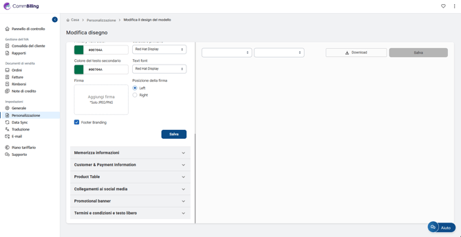 La personalizzazione delle tue fatture ti permette di creare documenti che riflettono completamente l identità e la professionalità della tua azienda. Con CommBilling puoi personalizzare ogni aspetto visivo delle tue fatture dai colori e dai caratteri fino al posizionamento del logo e ai campi visualizzati e garantire che ogni documento inviato sia in linea con la tua marca e con i tuoi standard di comunicazione.