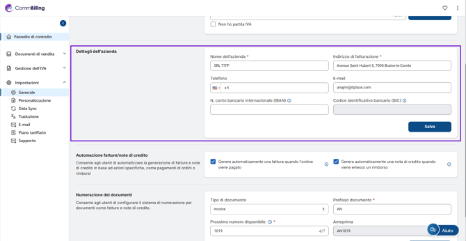 In questa sezione è possibile inserire e convalidare il numero di partita IVA del negozio. CommBilling controlla automaticamente la validità del numero di partita IVA per garantire che l'azienda sia conforme alle normative IVA dell'UE.