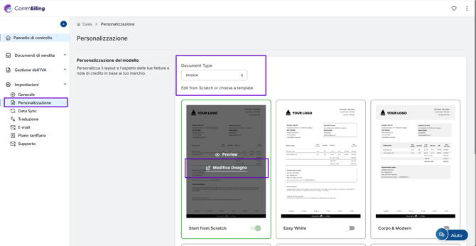 Funziona come il pannello di controllo principale per definire l’aspetto e il comportamento delle tue fatture, note di credito ed email garantendo che il tuo account sia completamente allineato alle esigenze operative e di branding della tua attività.