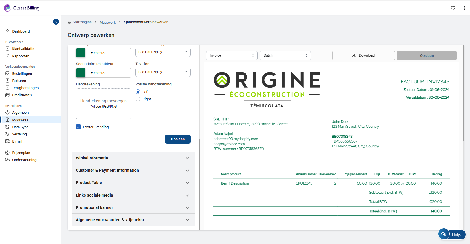 Het personaliseren van je facturen stelt je in staat om documenten te creëren die volledig de identiteit en professionaliteit van je bedrijf weerspiegelen. Met CommBilling kun je elk visueel aspect van je facturen aanpassen – van kleuren en lettertypes tot de plaatsing van je logo en de weergegeven velden – zodat elk document dat je verstuurt aansluit bij de stijl en communicatiestandaarden van jouw merk.