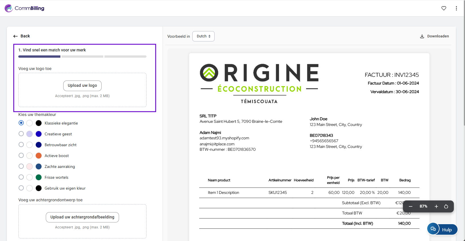 - Stap 1: Upload het logo van uw bedrijf, kies uw themakleur en klik op Volgende.