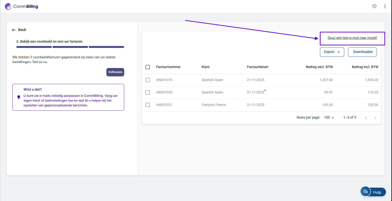 Uw snelle installatie is nu voltooid en uw factureringsapp is klaar voor gebruik. U kunt nu beginnen met het genereren van facturen met het extra voordeel dat CommBilling automatisch drie facturen gratis genereert als onderdeel van uw onboardingervaring. Verdere aanpassingen kunnen op elk moment worden gedaan in het tabblad Instellingen.