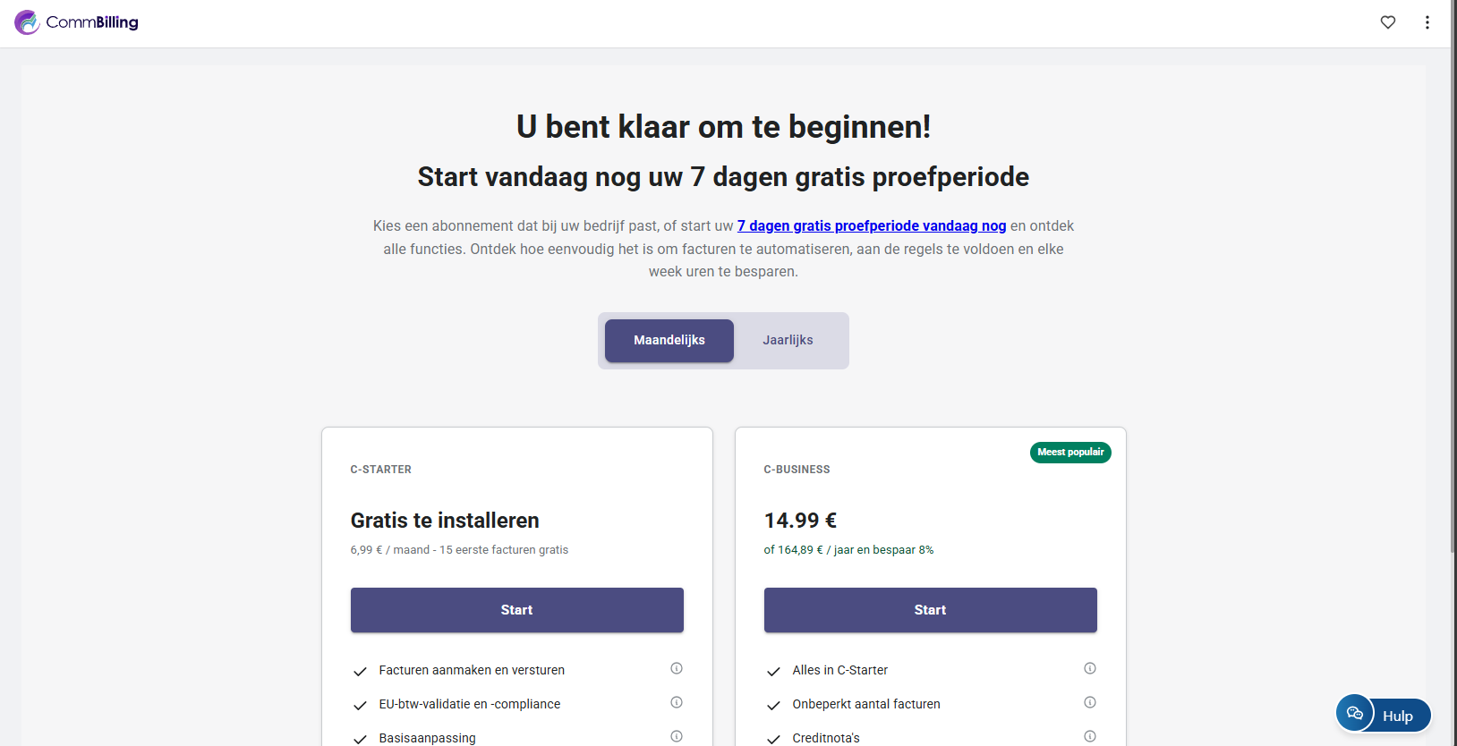 - Na het voltooien van de onboarding wordt u doorgestuurd naar de pagina met prijsplannen. Het kiezen van een plan is verplicht voordat u CommBilling kunt gebruiken en de gratis proefperiode van zeven dagen is beschikbaar voor beide plannen.