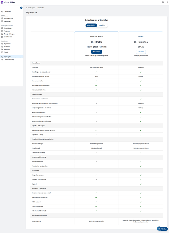 Het prijstabblad is uw centrale plaats om uw abonnement te kiezen en te beheren. Met een gratis proefperiode van zeven dagen voor beide plannen kunt u CommBilling met vertrouwen verkennen en het plan kiezen dat uw facturatieproces en bedrijfsontwikkeling het beste ondersteunt.