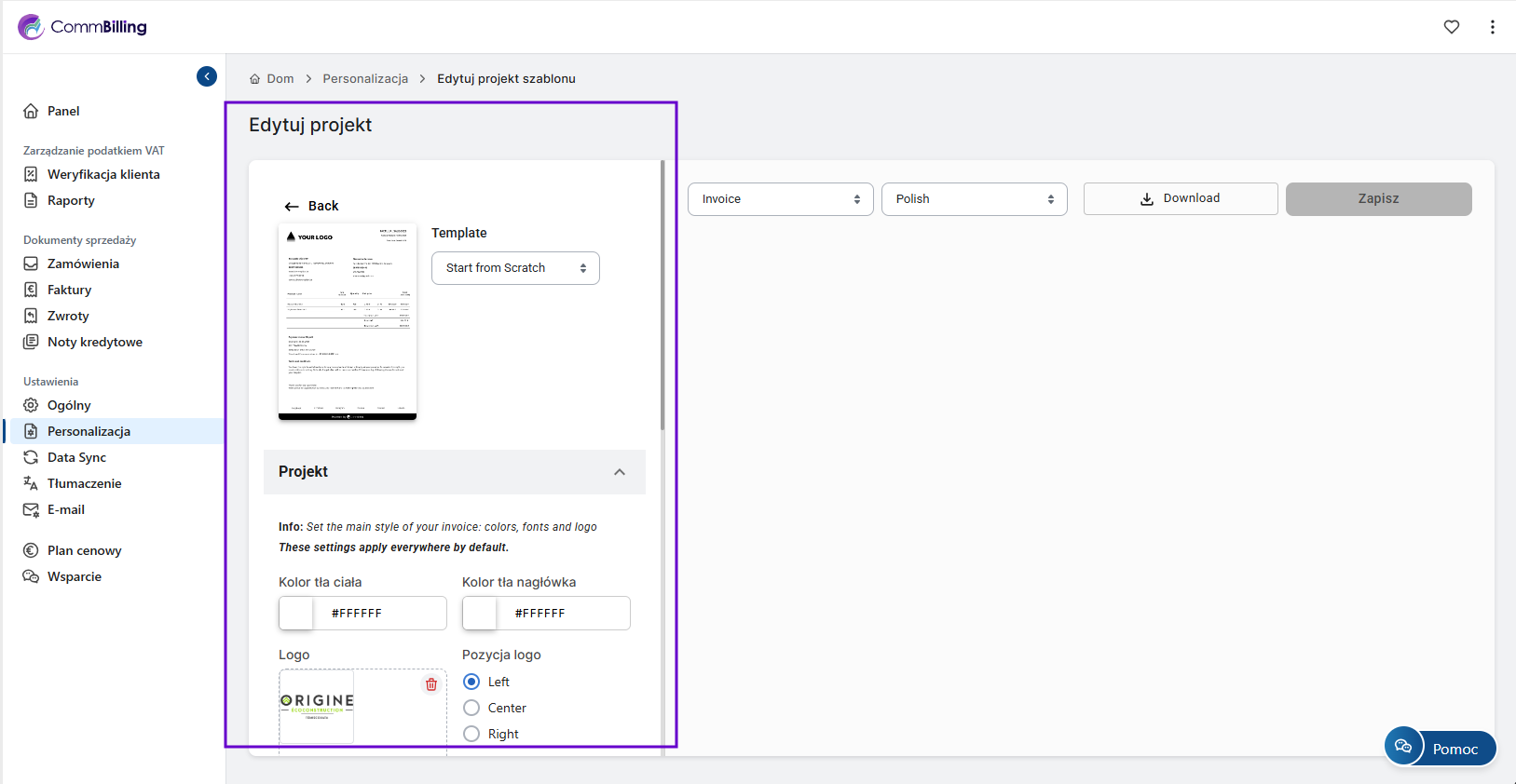 CommBilling oferuje elastyczne opcje projektowe dzięki którym możesz dostosować kolory czcionki pola i elementy brandingowe aby każdy wysyłany dokument był profesjonalny i zgodny z wizerunkiem twojej marki.