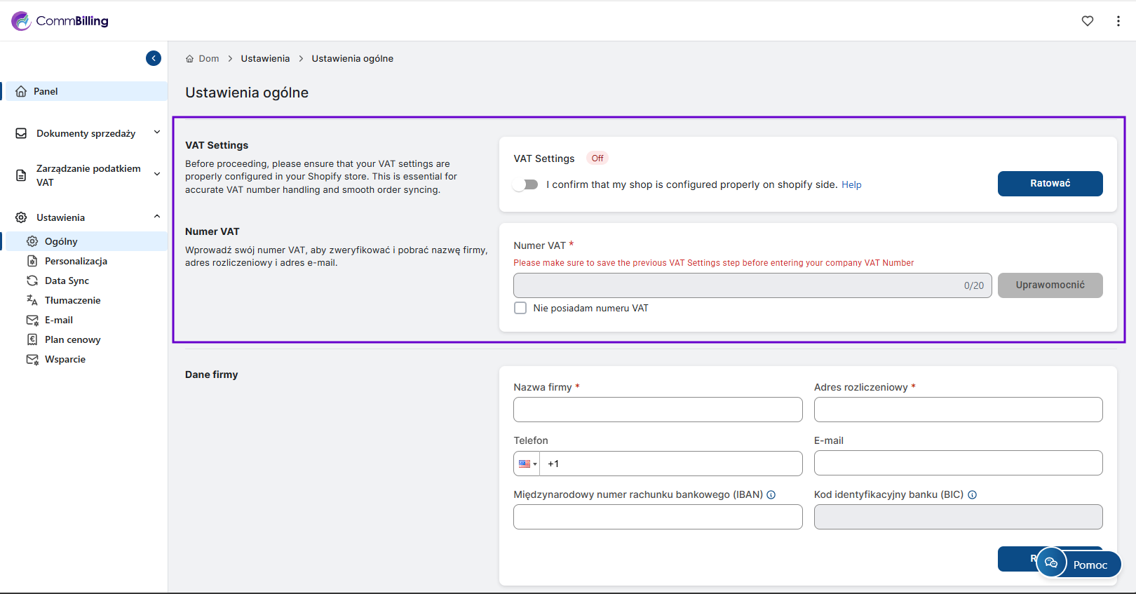 W tym miejscu można wprowadzić i zweryfikować numer VAT sklepu. CommBilling automatycznie sprawdza jego poprawność, zapewniając zgodność z regulacjami UE.