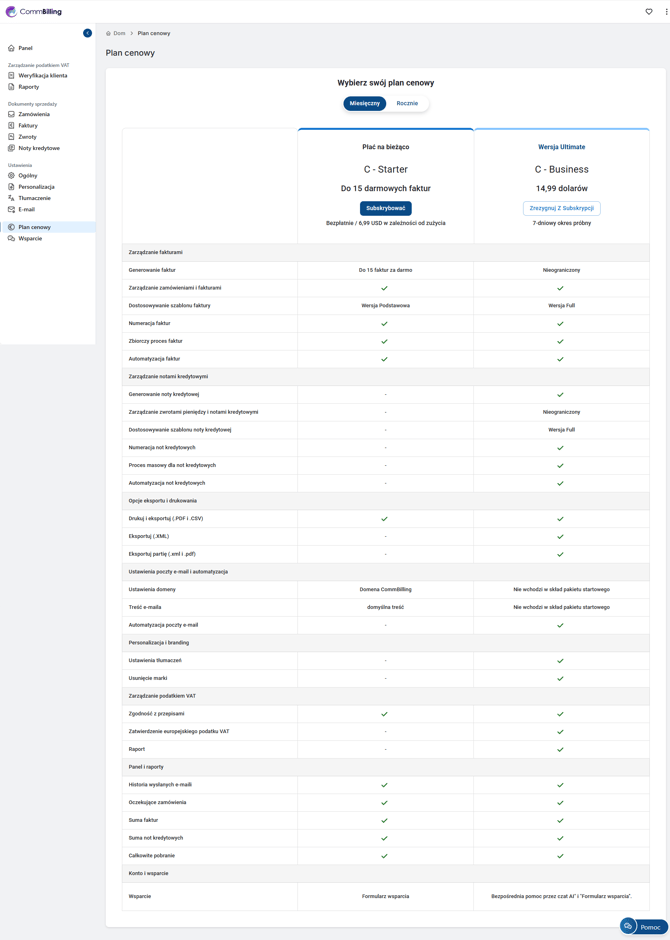 Karta Plan cenowy w CommBilling zapewnia jasny i szczegółowy przegląd dostępnych opcji subskrypcji. Pomaga porównać plany C Starter i C Business aktywować subskrypcję oraz zarządzać przyszłymi zmianami. Ta sekcja gwarantuje że możesz łatwo wybrać plan który najlepiej odpowiada twoim potrzebom operacyjnym i fakturowym.