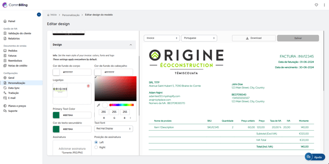 Com os modelos profissionais pré-definidos do CommBilling, começa já com um design pronto para uso empresarial. A flexibilidade adicional para personalizar as cores de fundo, do banner e dos títulos permite que as suas faturas reflitam totalmente a identidade visual da sua marca, mantendo simultaneamente clareza e elegância.