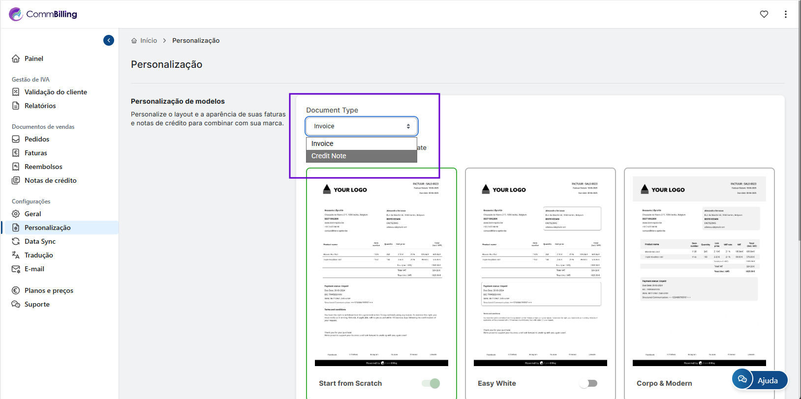 Pode editar o seu modelo de nota de crédito diretamente nas definições de personalização do CommBilling. Siga os passos abaixo para actualizar o design de acordo com as suas preferências.