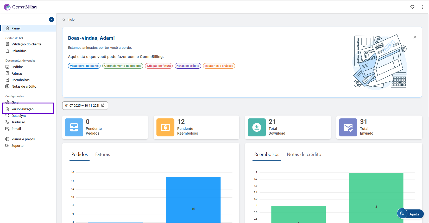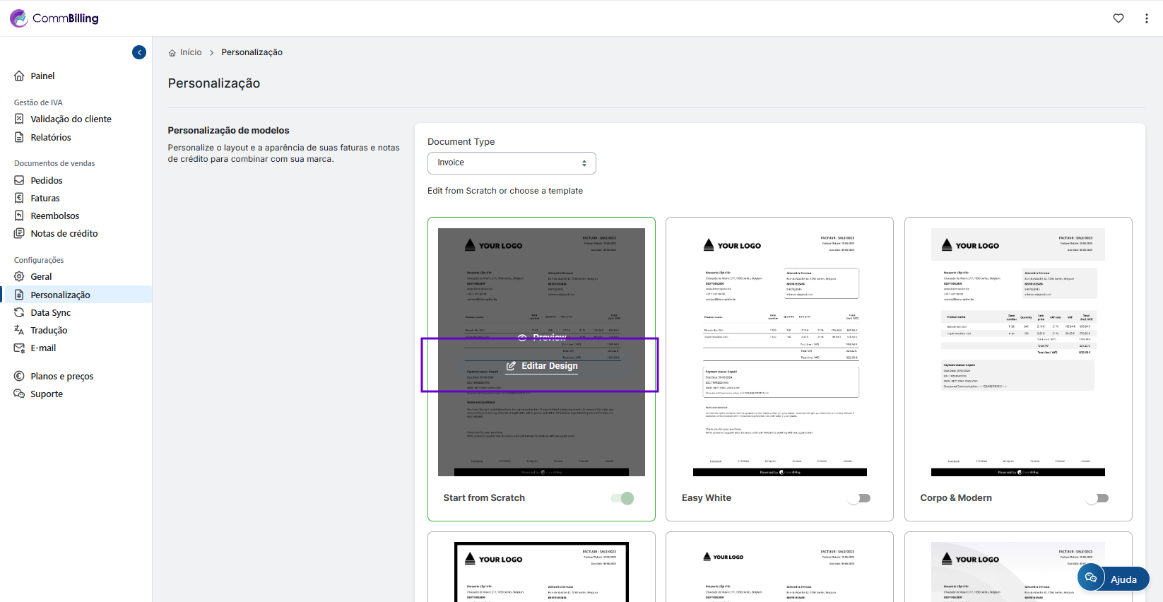 Ao gerir os campos que aparecem nas suas faturas garante que os seus documentos permanecem relevantes claros e profissionais. O CommBilling oferece lhe a flexibilidade de adaptar cada fatura às necessidades da sua empresa mantendo ao mesmo tempo uma imagem de marca consistente em toda a comunicação com os clientes.