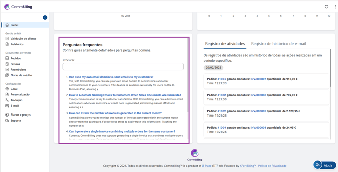 A secção de FAQ fornece acesso rápido a perguntas frequentes, artigos e guias. Aqui, encontrará soluções para problemas comuns, dicas sobre como maximizar as funcionalidades do CommBilling e conselhos de resolução de problemas. Esta secção é constantemente atualizada para garantir que tem o suporte de que necessita ao seu alcance.