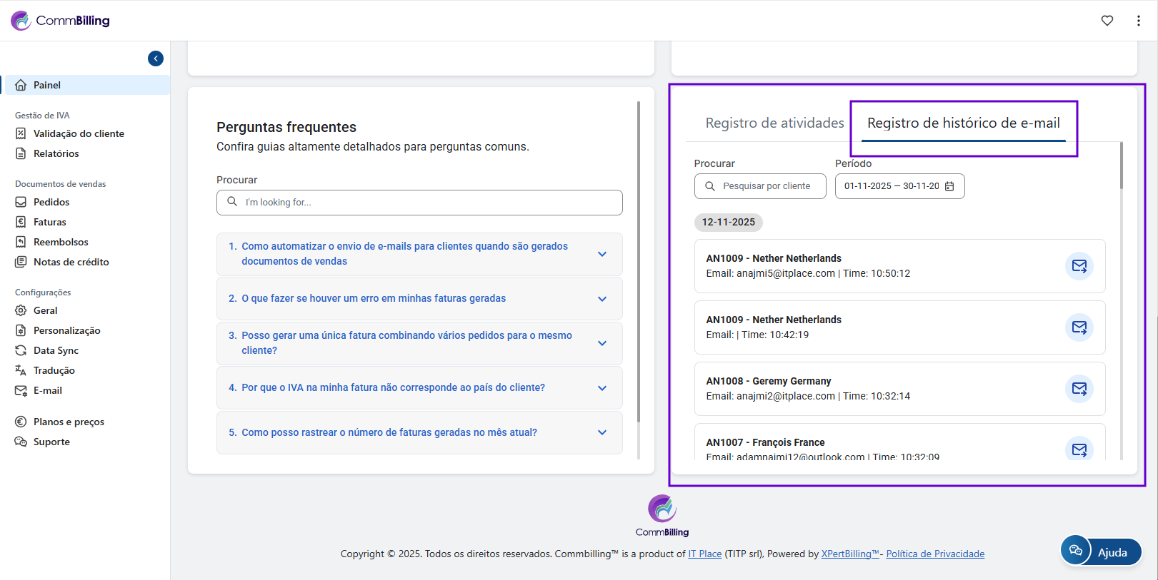 O Registo de Histórico de E-mail permite-lhe monitorizar todos os e-mails enviados relacionados com a faturação, incluindo faturas, notas de crédito e lembretes de pagamento. Pode acompanhar o estado de cada e-mail (por exemplo, enviado, entregue, falhado) e garantir que os seus clientes recebem os seus documentos de faturação a tempo. Esta secção dá-lhe tranquilidade ao fornecer um registo de comunicação completo entre si e os seus clientes.